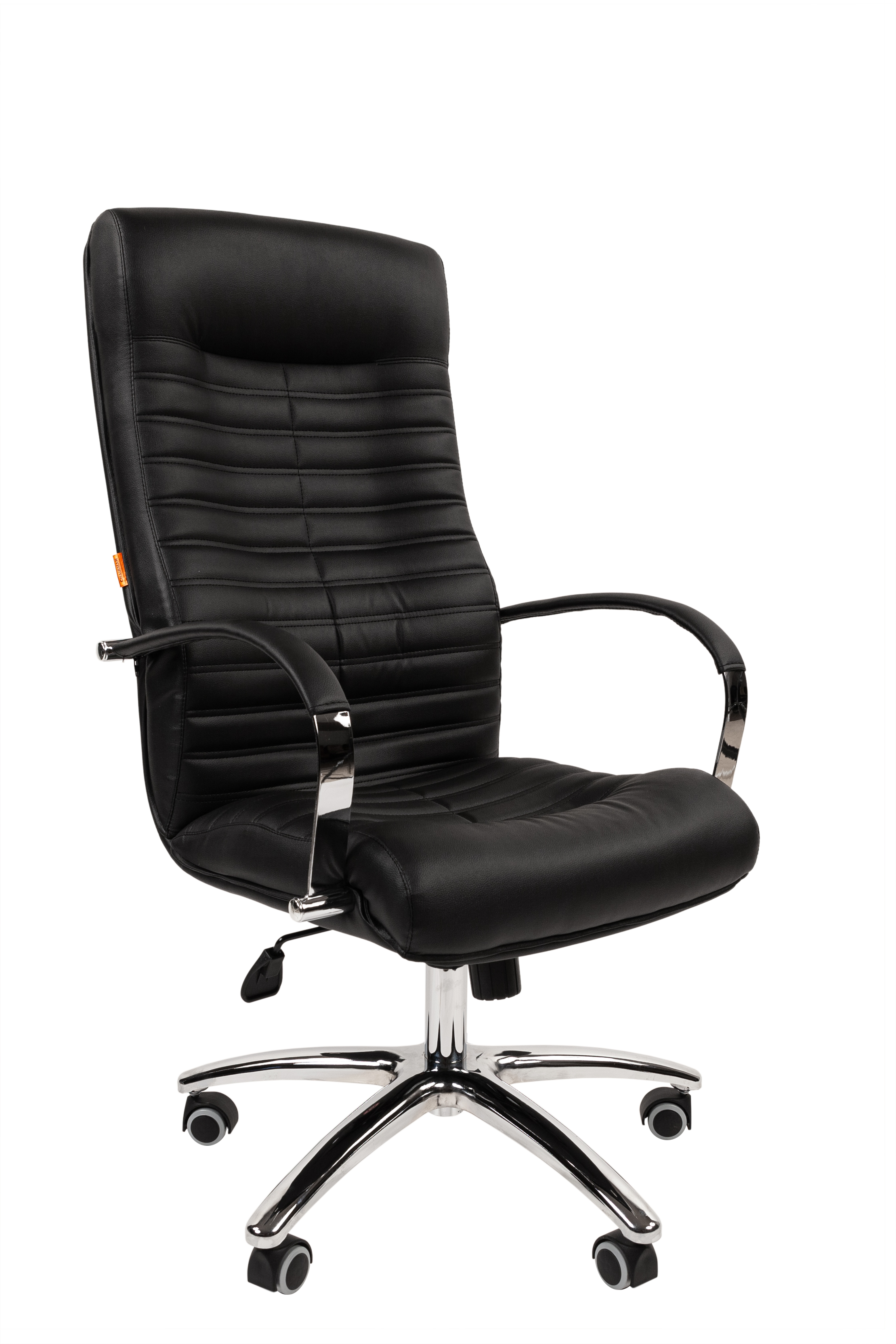 Стильное, необычное кресло руководителя. Его горизонтальный геометрический рисунок эффектно оттеняется хромированными элементами конструкции, а высокая эргономика достигается за счет анатомической формы и механизма качания повышенной комфортности.