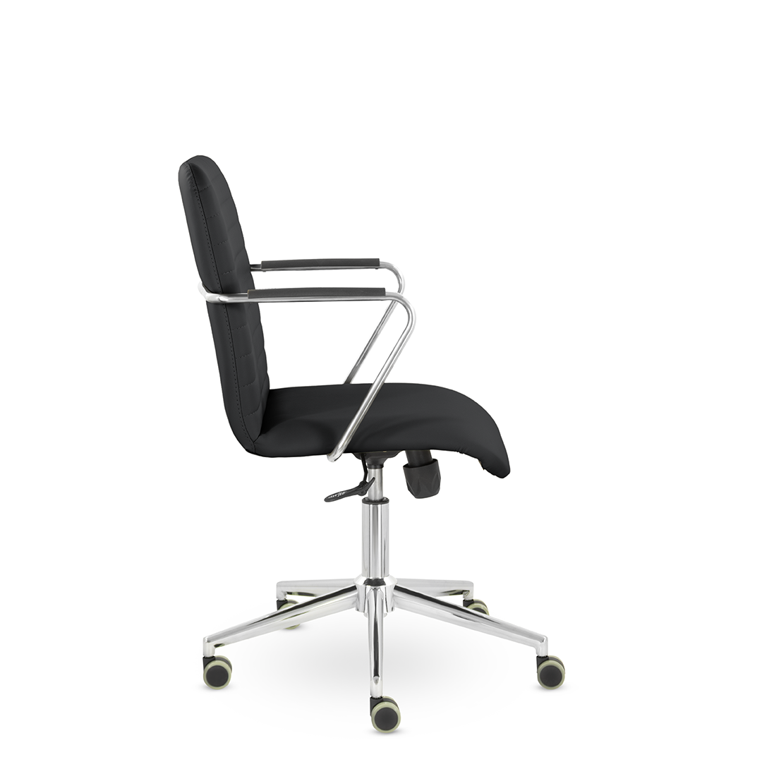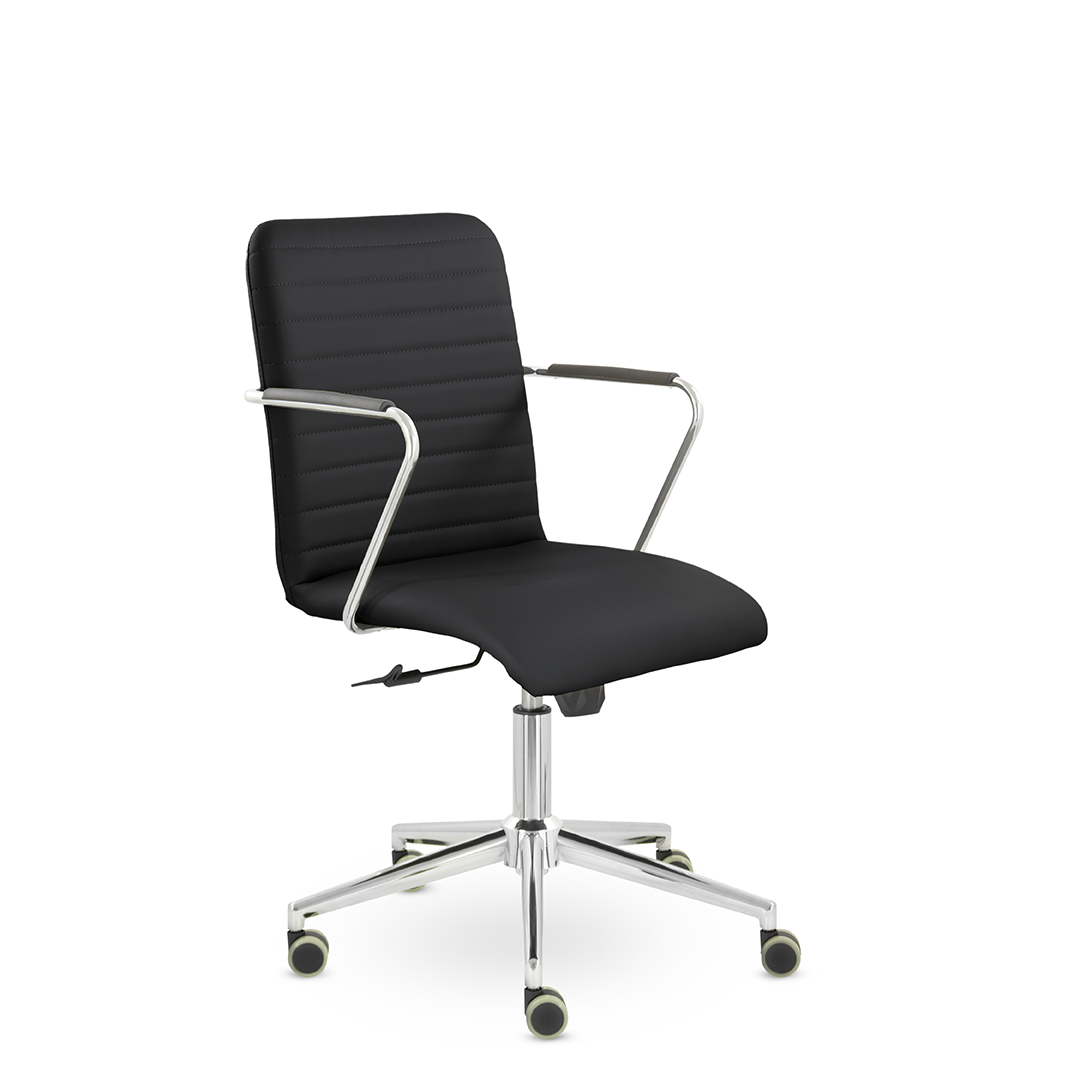 Уникальный каркас из металла и узкие хромированные подлокотники с небольшими пластиковыми накладками придают конструкции легкость и прочность. Горизонтальные строчки на спинке подчеркивают элегантный и современный вид. Хромированная крестовина выдерживает до 120 кг.