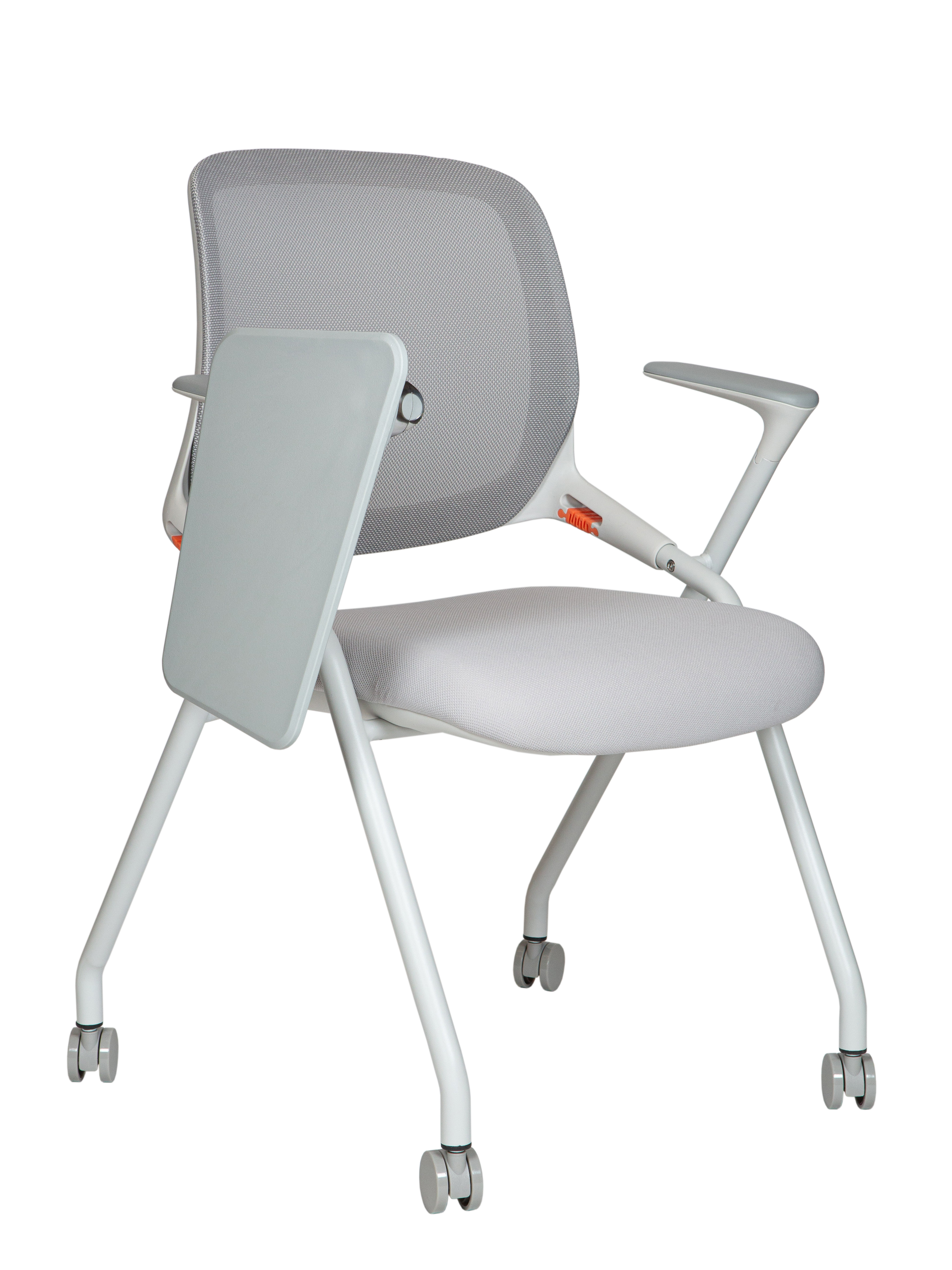 Современный офисный стул для учебных помещений и зон ожиданий. Пластик. Сиденье ткань, Спинка сетка. Цвет пластика белый. Основание металл, белый. Пюпитр. Ролики Стул выдерживает нагрузку до 90 кг. Гарантия год.