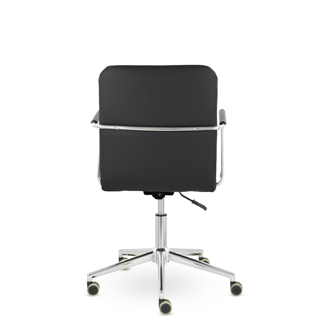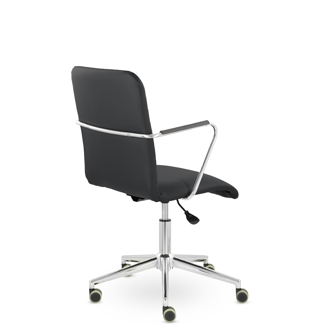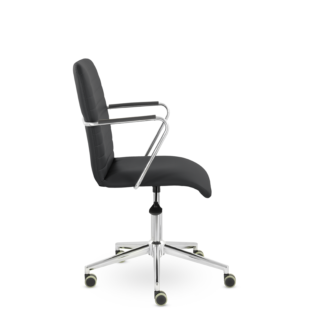 Уникальный каркас из металла и узкие хромированные подлокотники с небольшими пластиковыми накладками придают конструкции легкость и прочность. Горизонтальные строчки на спинке подчеркивают элегантный и современный вид.