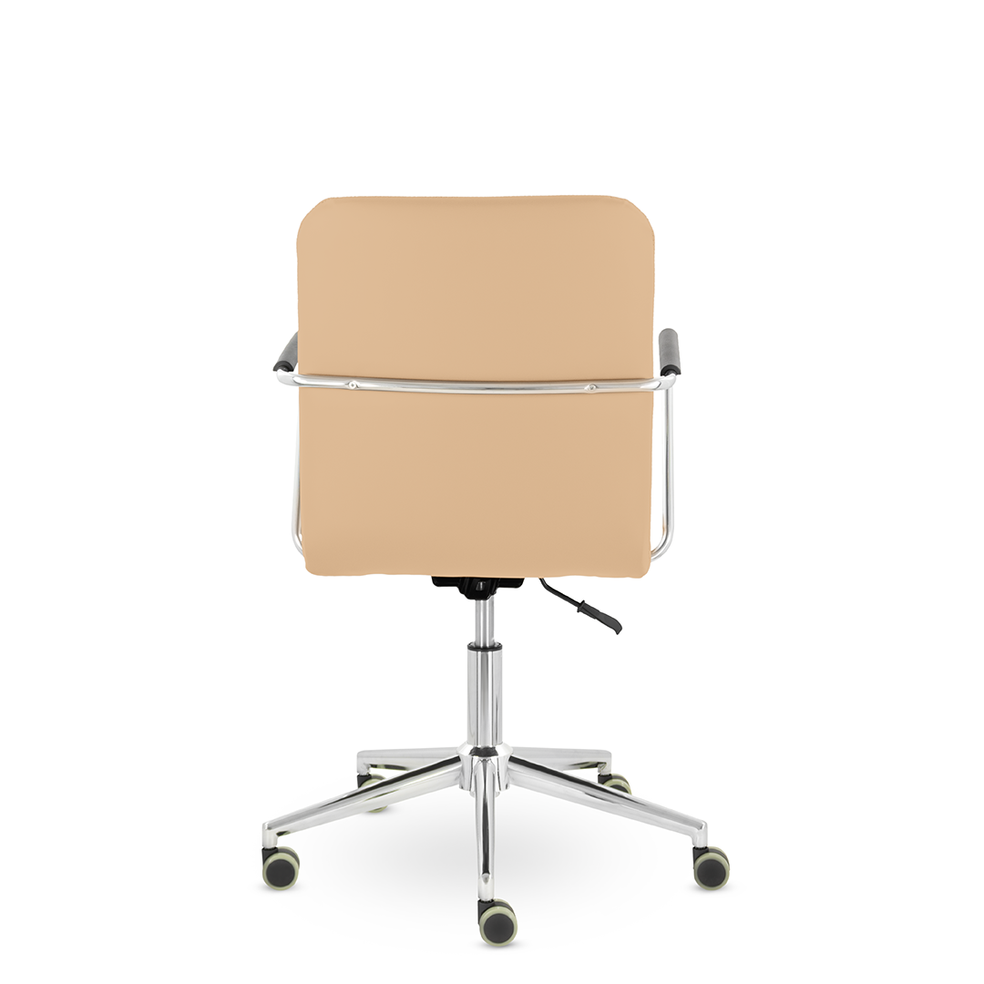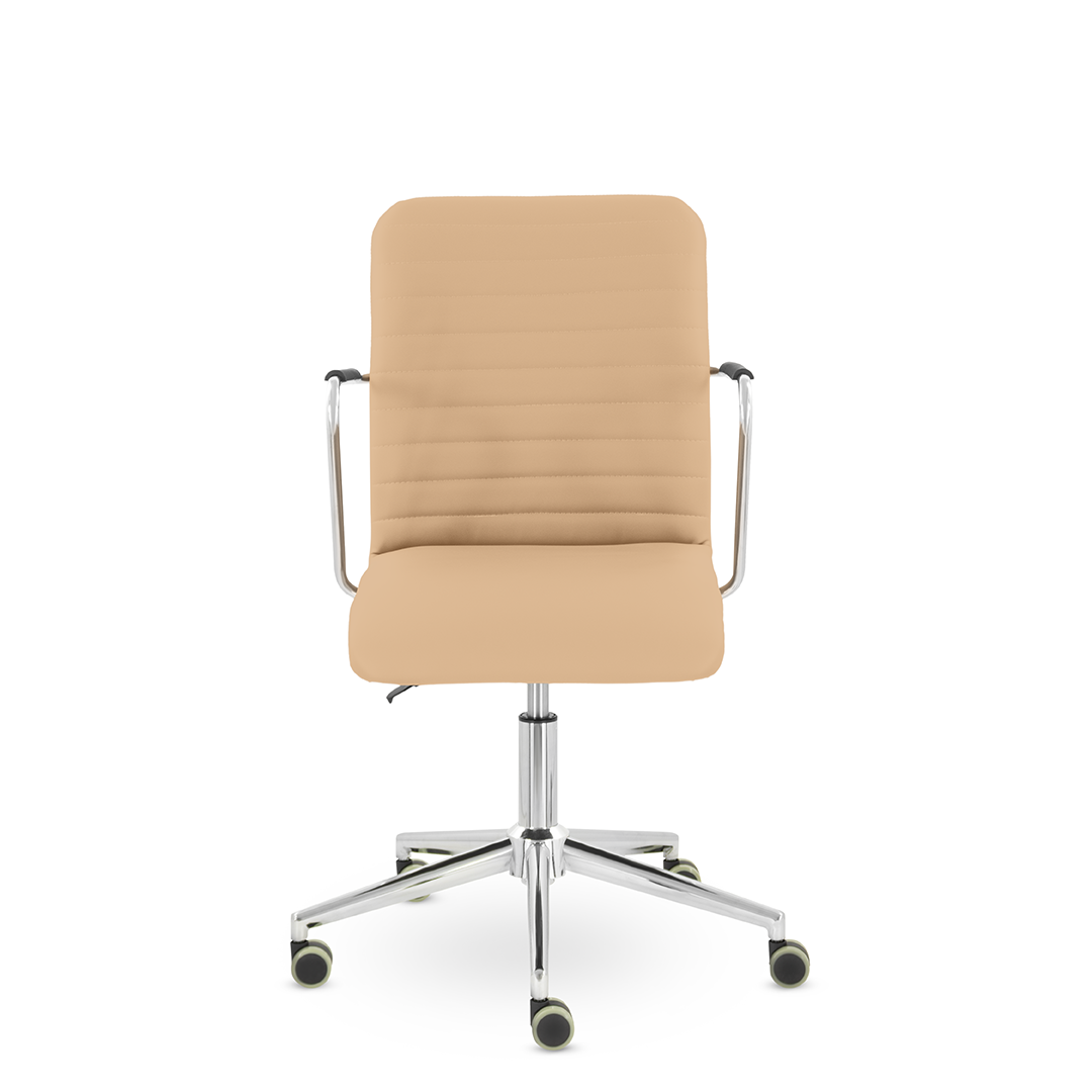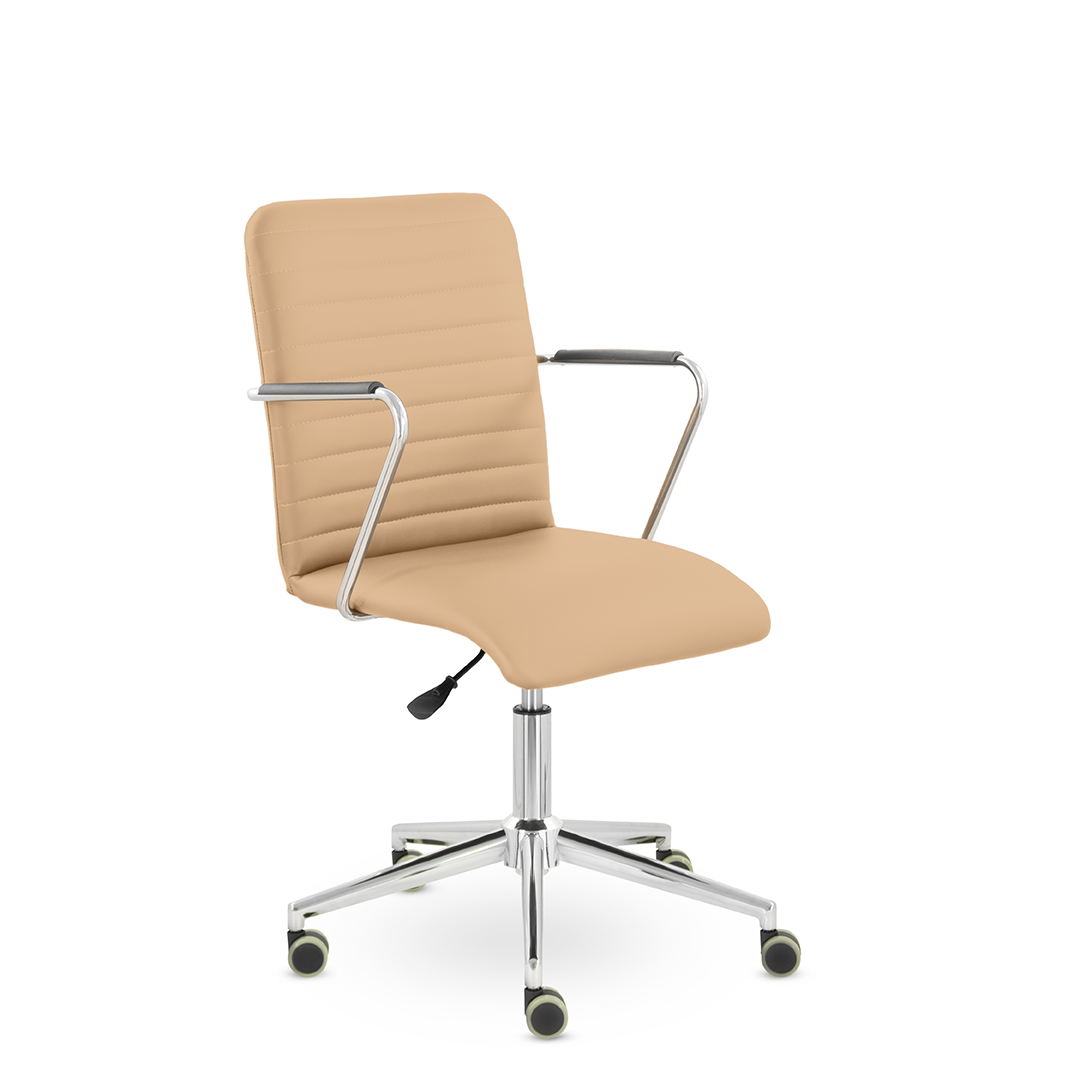 Уникальный каркас из металла и узкие хромированные подлокотники с небольшими пластиковыми накладками придают конструкции легкость и прочность. Горизонтальные строчки на спинке подчеркивают элегантный и современный вид.