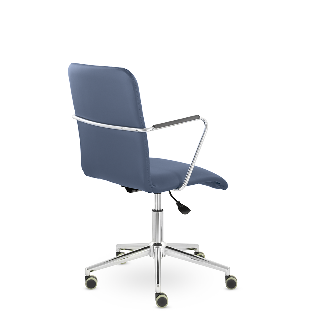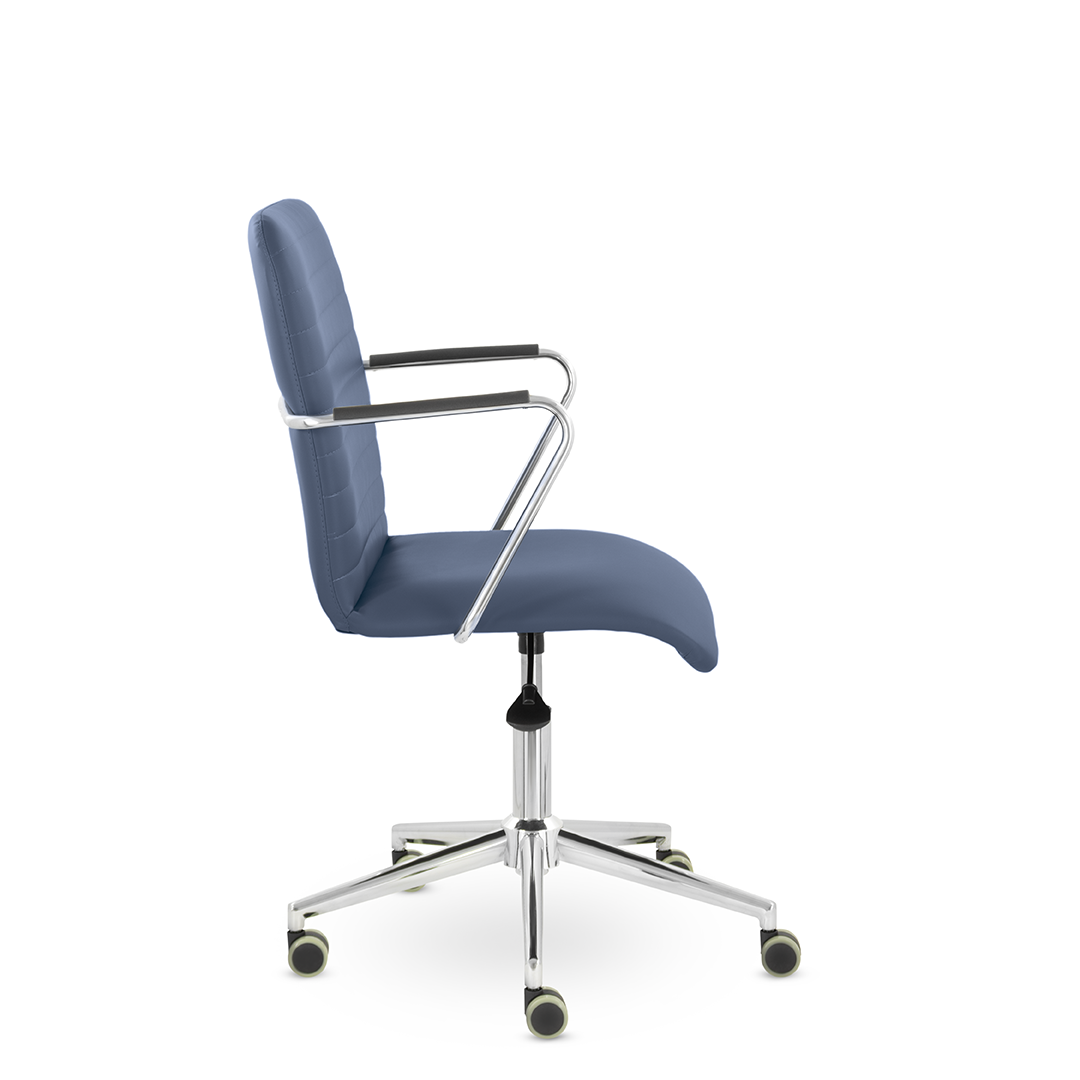 Уникальный каркас из металла и узкие хромированные подлокотники с небольшими пластиковыми накладками придают конструкции легкость и прочность. Горизонтальные строчки на спинке подчеркивают элегантный и современный вид.
