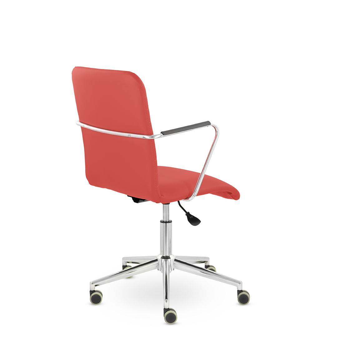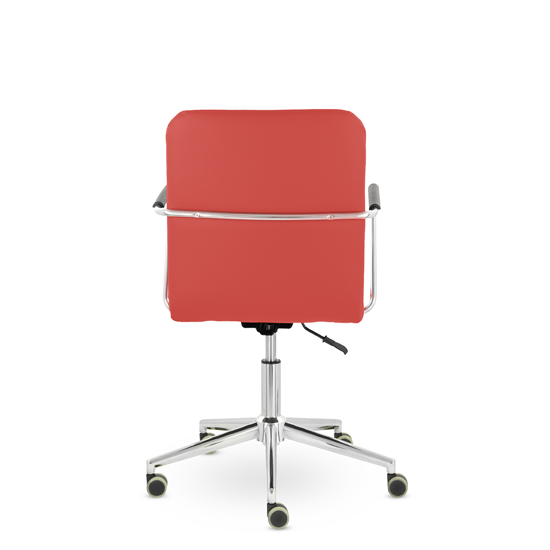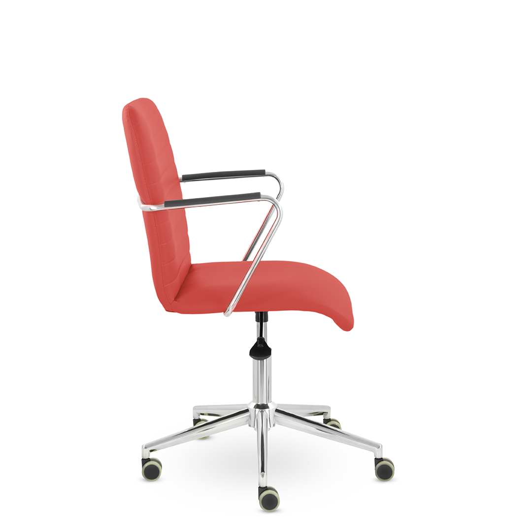 Уникальный каркас из металла и узкие хромированные подлокотники с небольшими пластиковыми накладками придают конструкции легкость и прочность. Горизонтальные строчки на спинке подчеркивают элегантный и современный вид.