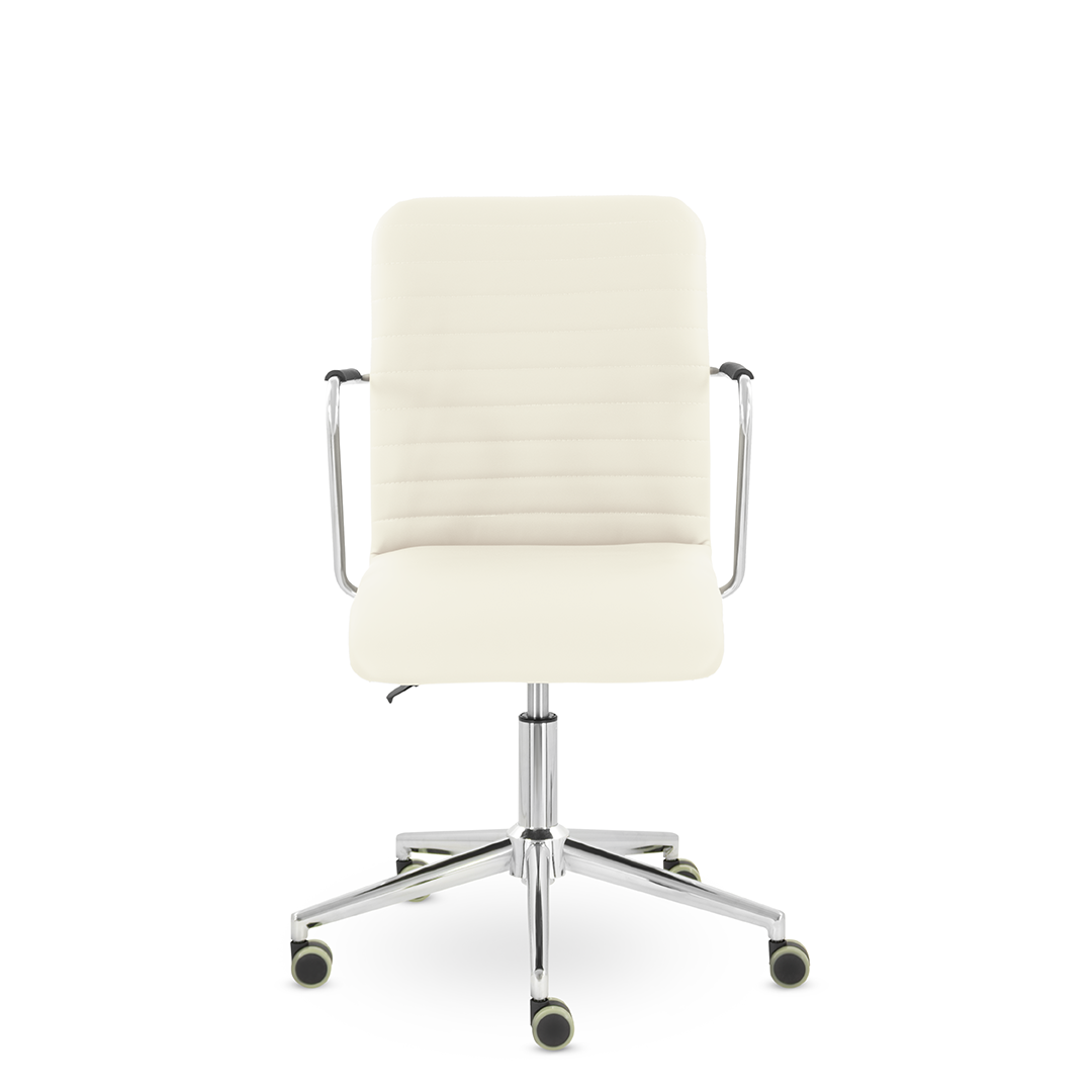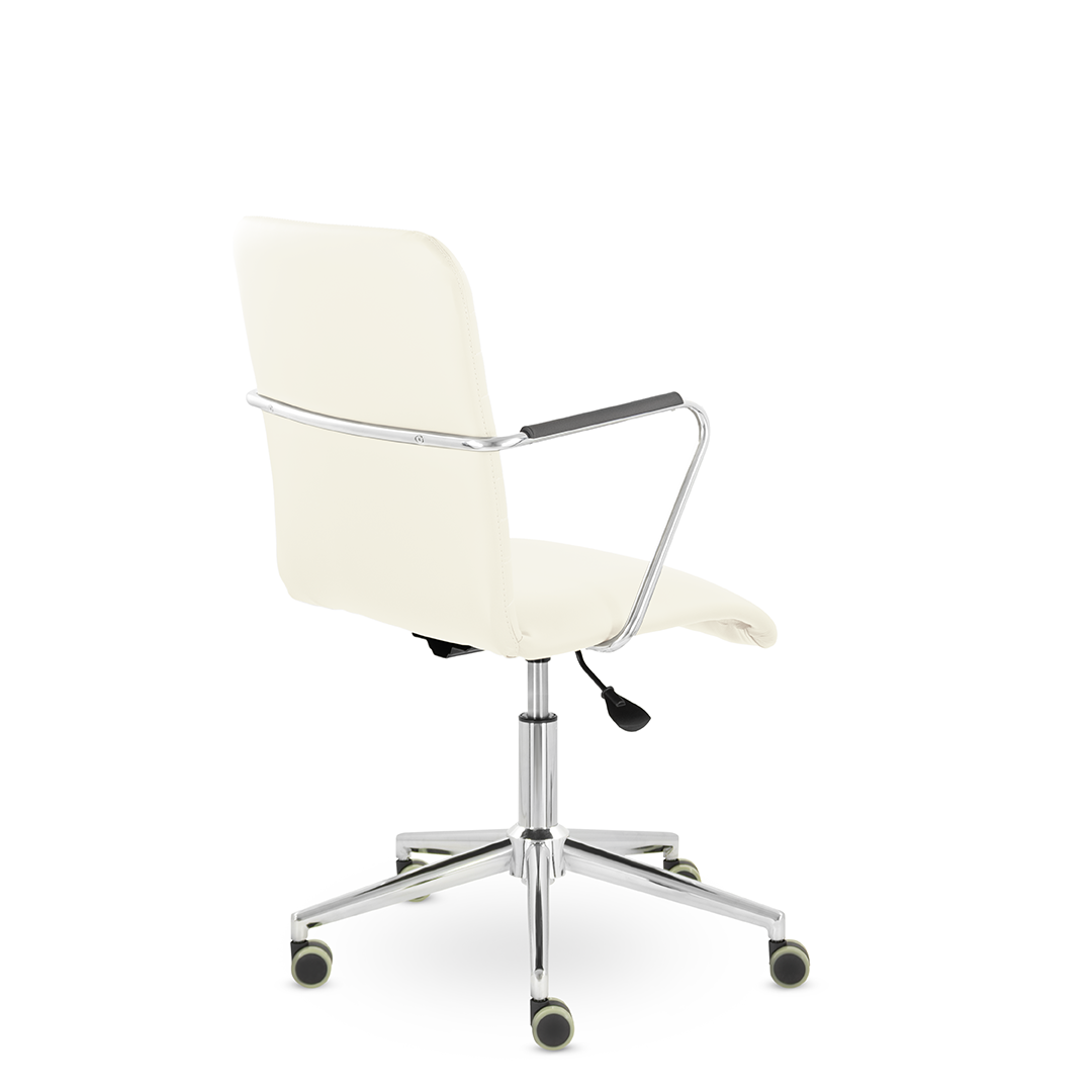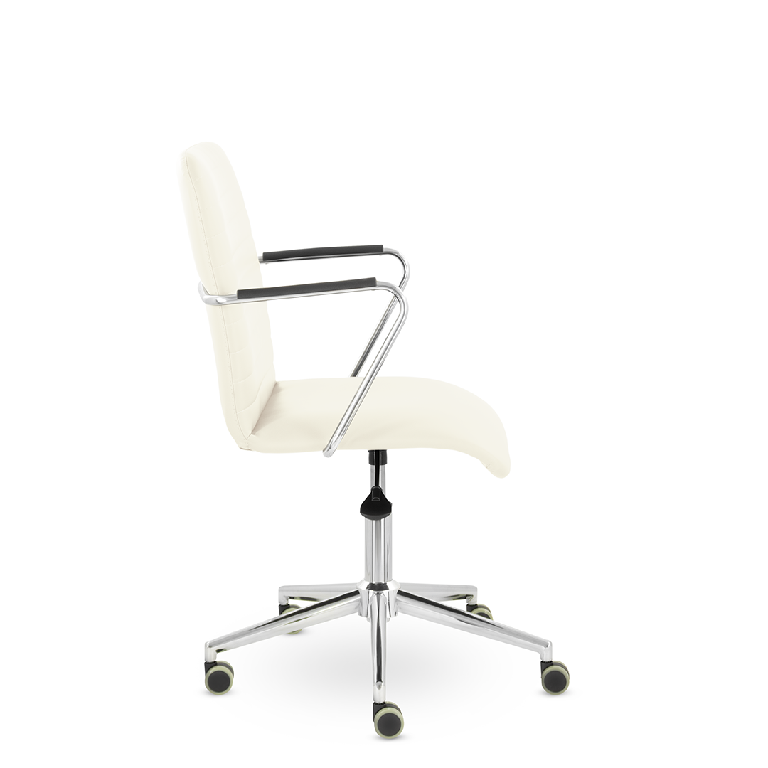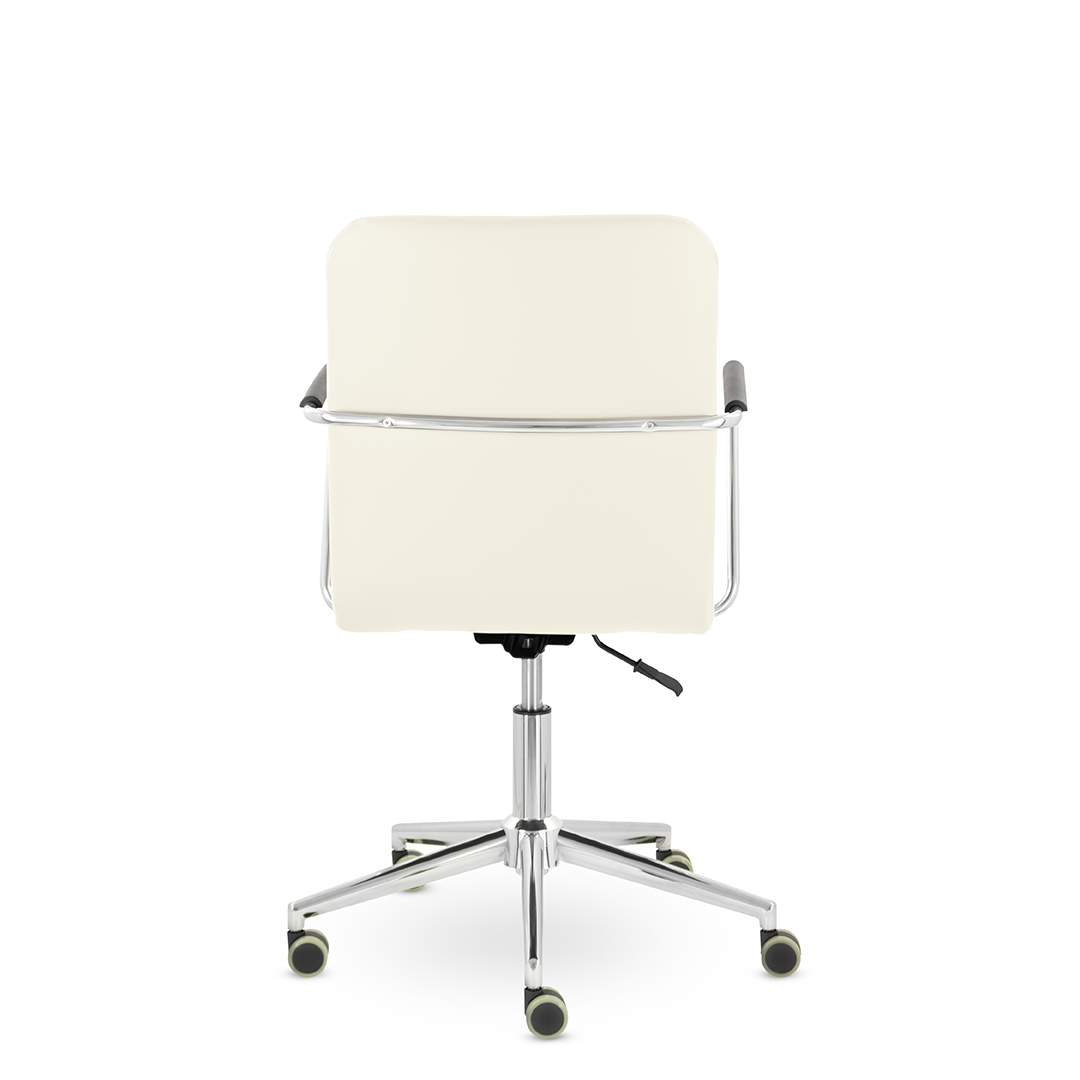 Уникальный каркас из металла и узкие хромированные подлокотники с небольшими пластиковыми накладками придают конструкции легкость и прочность. Горизонтальные строчки на спинке подчеркивают элегантный и современный вид.