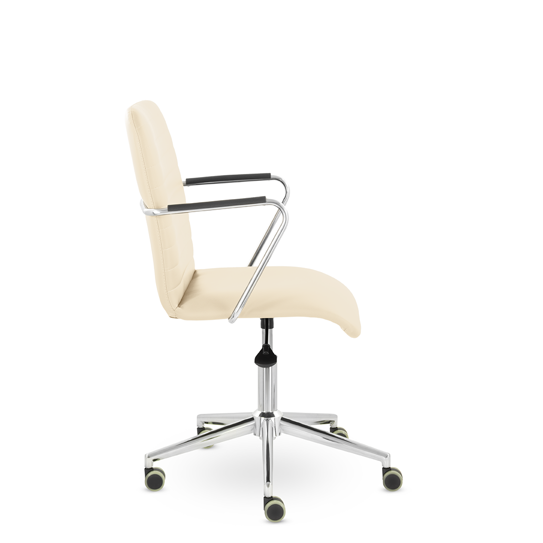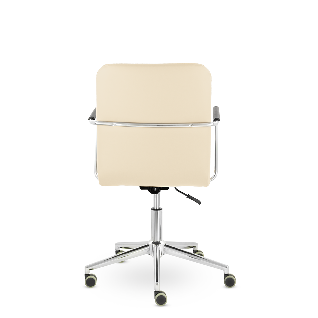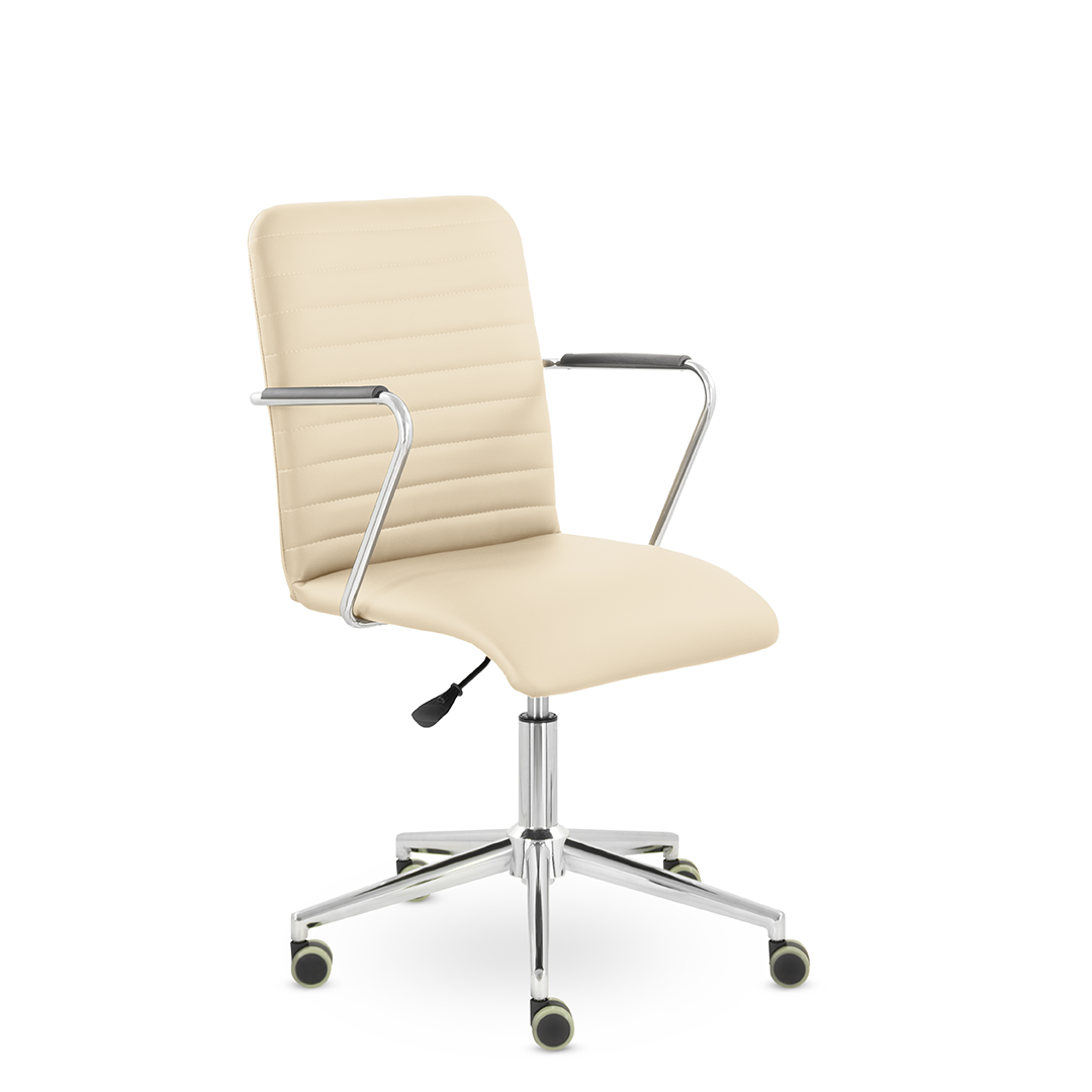 Уникальный каркас из металла и узкие хромированные подлокотники с небольшими пластиковыми накладками придают конструкции легкость и прочность. Горизонтальные строчки на спинке подчеркивают элегантный и современный вид.