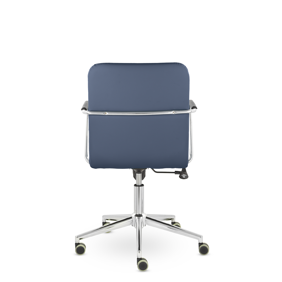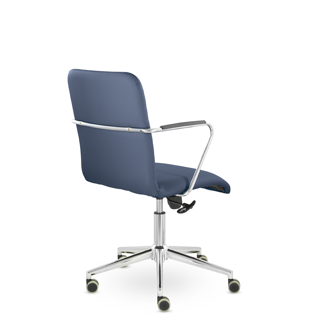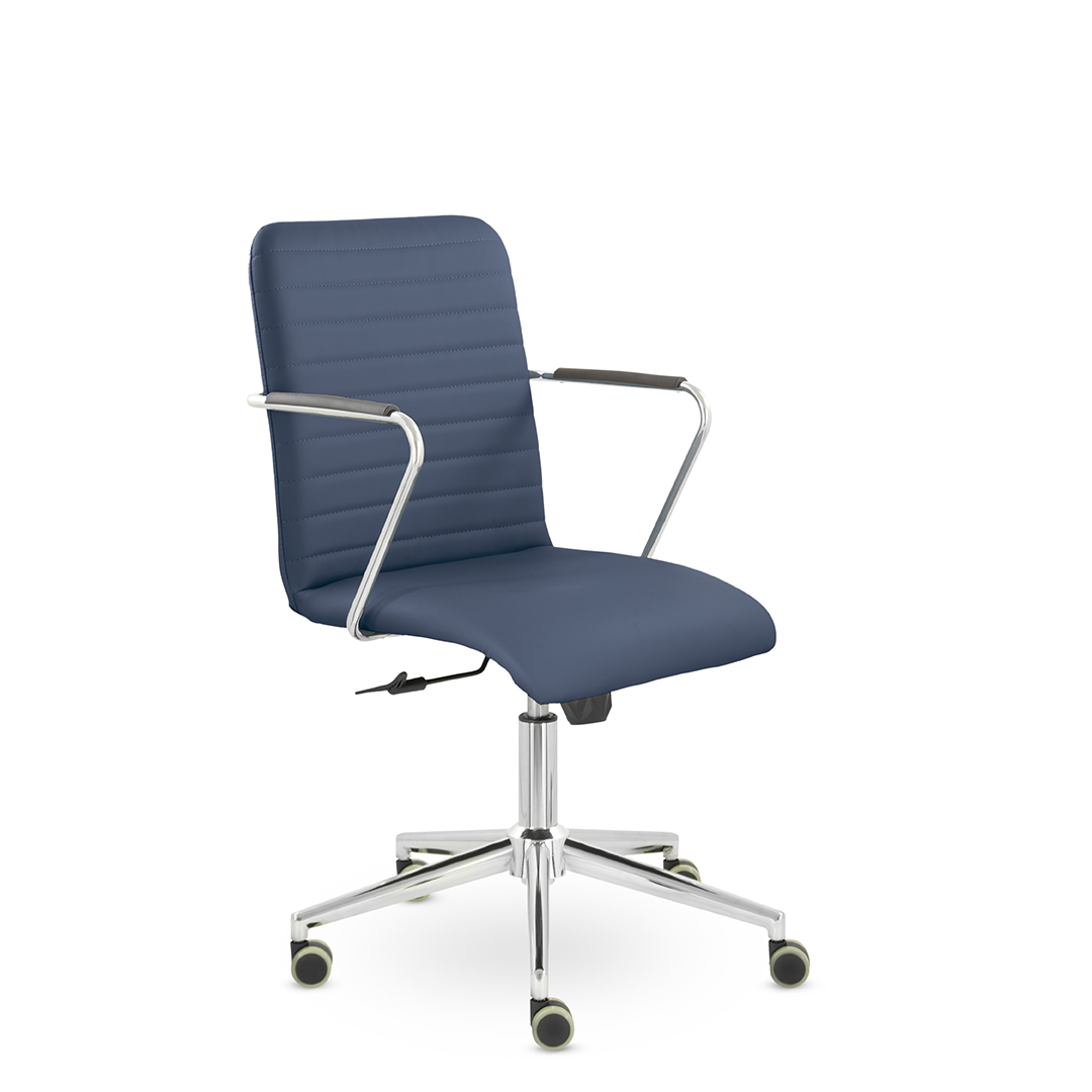 Уникальный каркас из металла и узкие хромированные подлокотники с небольшими пластиковыми накладками придают конструкции легкость и прочность. Горизонтальные строчки на спинке подчеркивают элегантный и современный вид. Хромированная крестовина выдерживает до 120 кг.