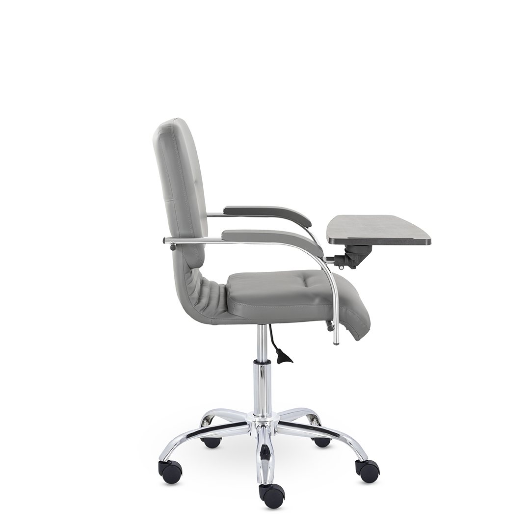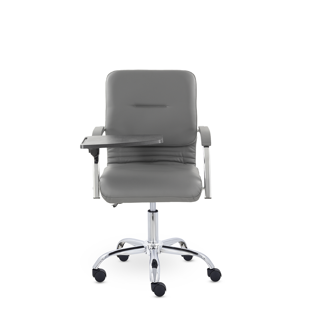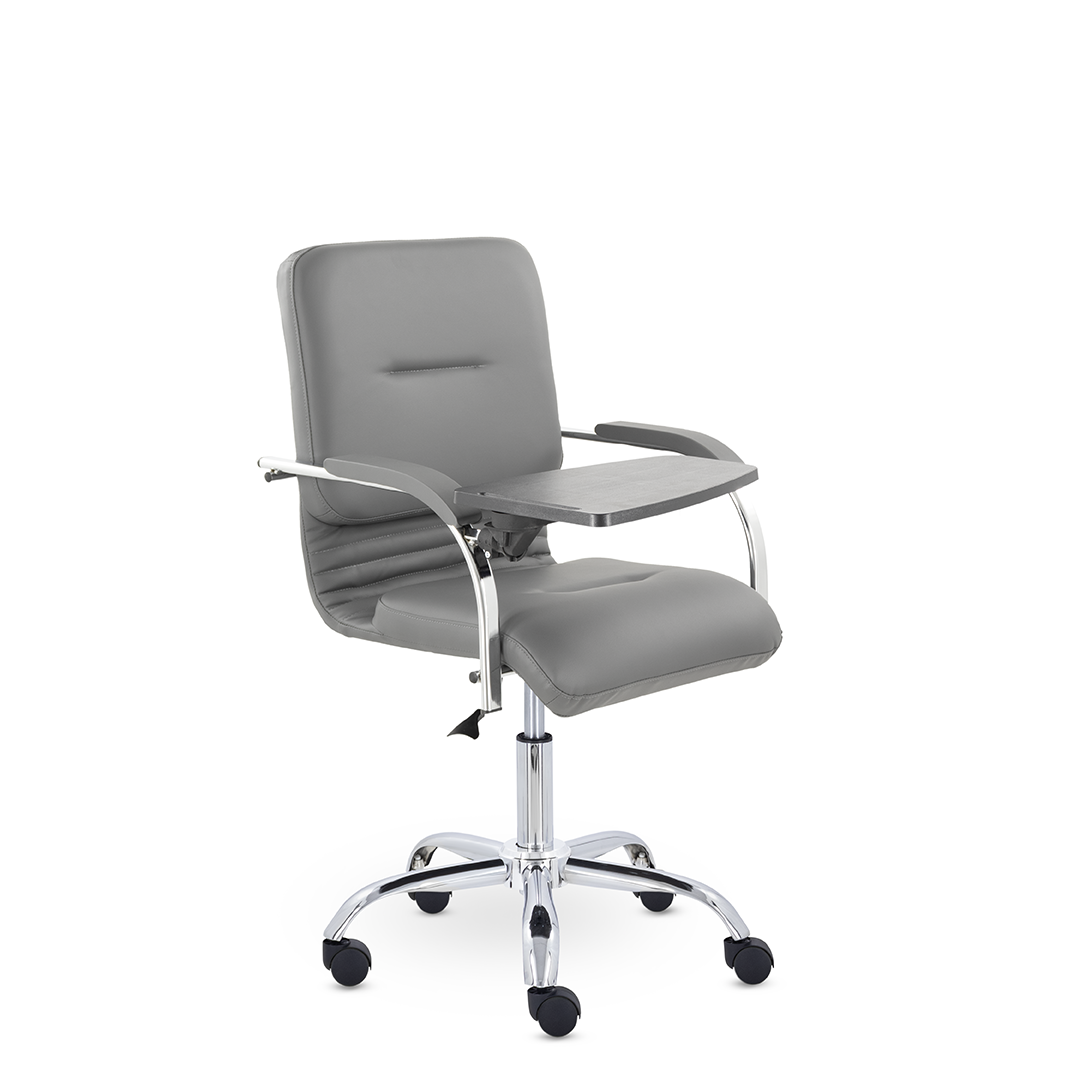 Улучшенная комплектация кресла включает горизонтальные прострочки, соединяющие спинку и сиденье, что придает креслу современный нео-классический стиль. Удобные накладки обеспечивают комфортную поддержку рук и способствуют их расслаблению. К креслу прилагается столик, выполненный из пластика. Модель отлично подойдет для конференц-залов, переговорных, актовых залов.