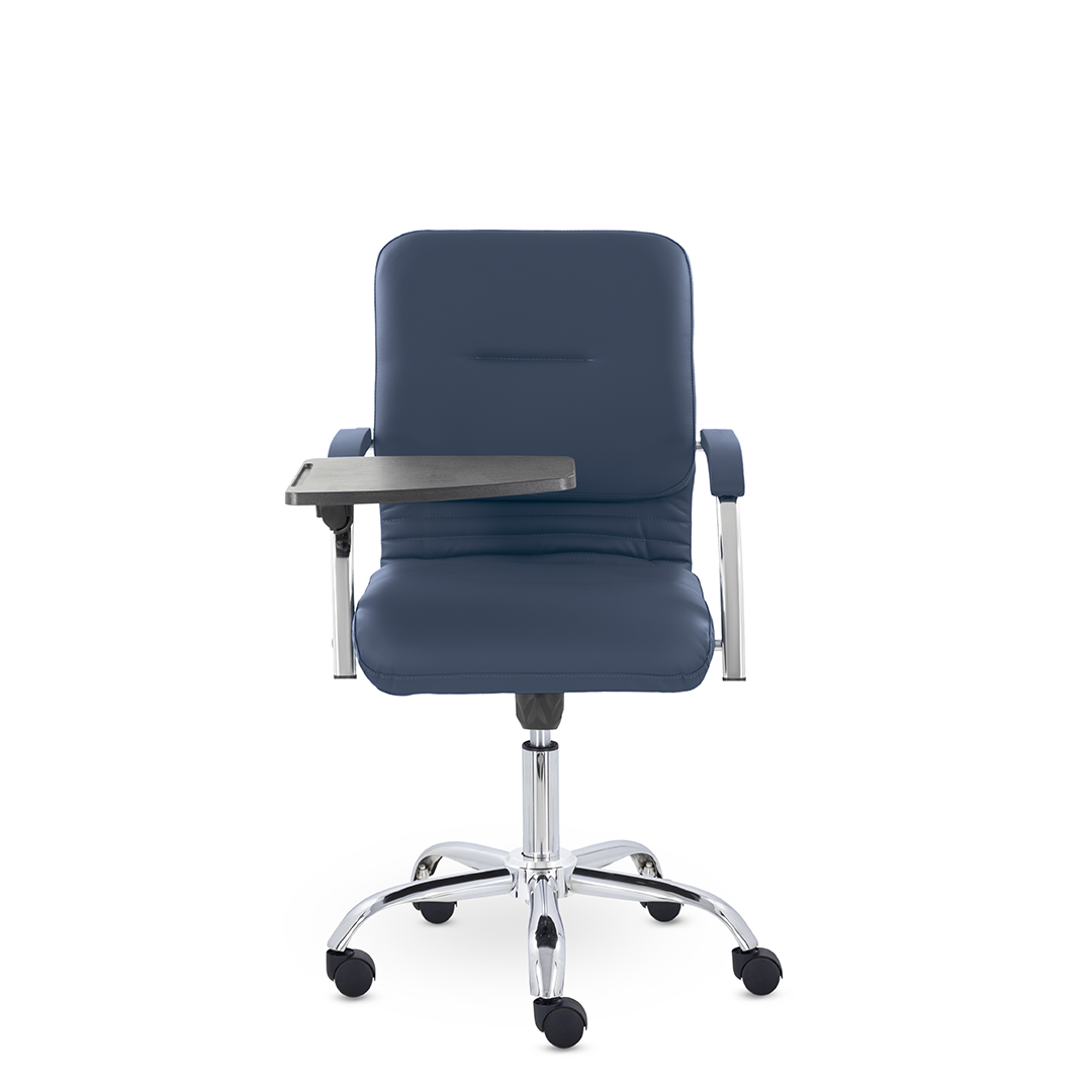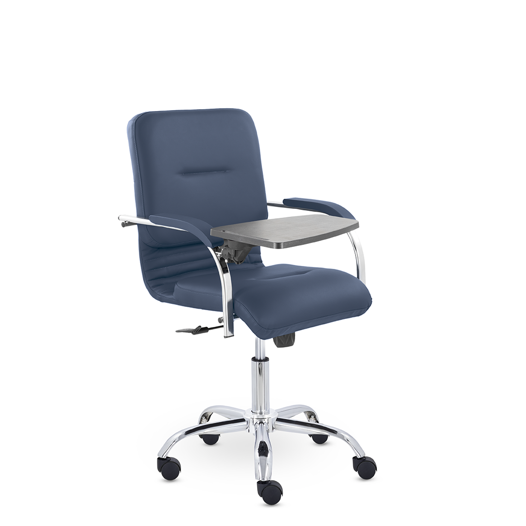 Улучшенная комплектация кресла включает горизонтальные прострочки, соединяющие спинку и сиденье, что придает креслу современный нео-классический стиль. Удобные накладки обеспечивают комфортную поддержку рук и способствуют их расслаблению. К креслу прилагается столик, выполненный из пластика. Модель отлично подойдет для конференц-залов, переговорных, актовых залов.
