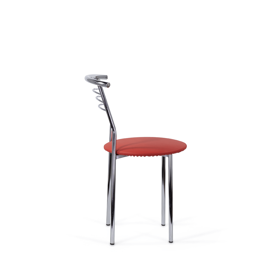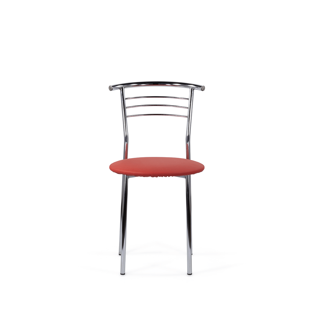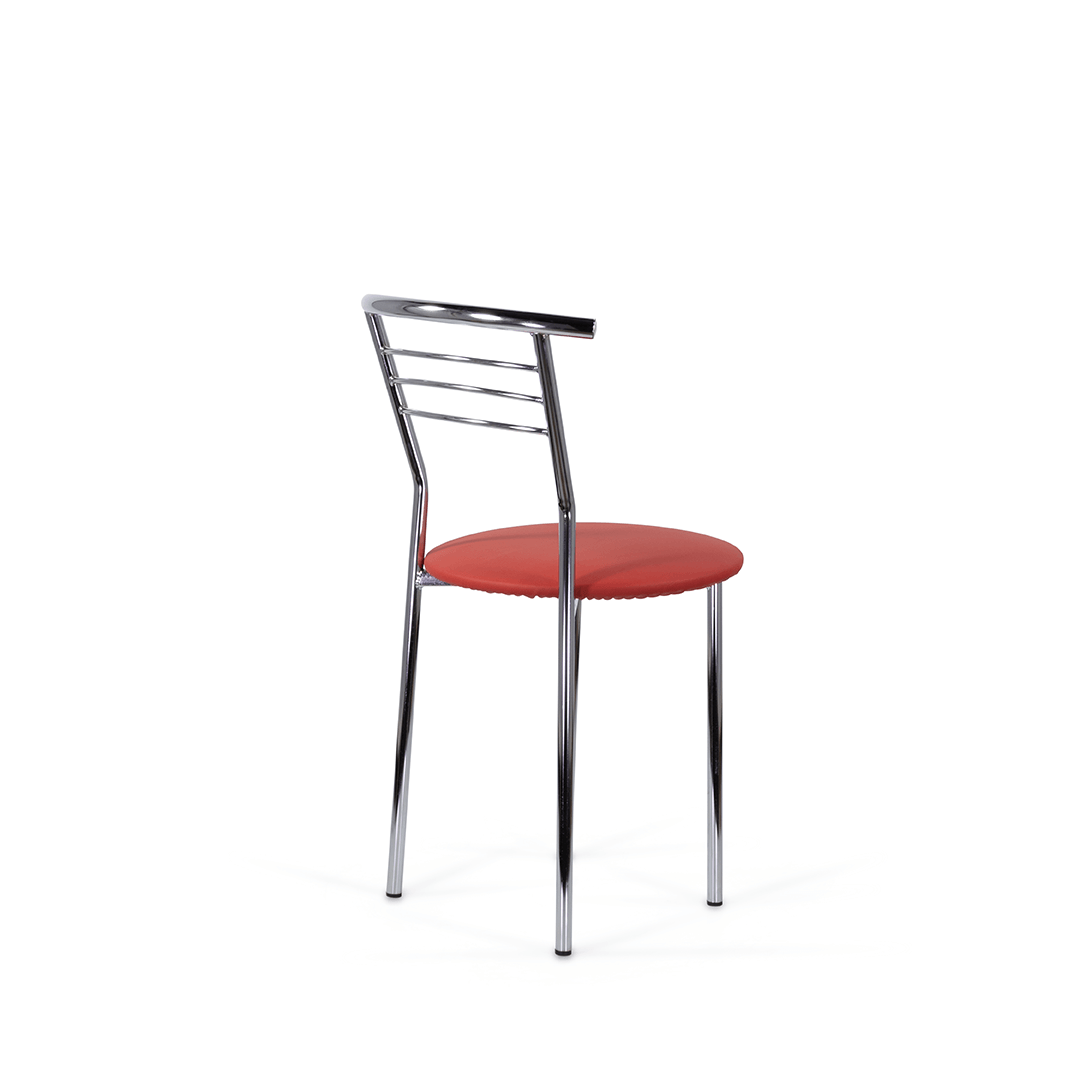 Стул с широким круглым сиденьем и удобной округлой хромированной спинкой. Простые, четкие линии силуэта и компактный размер позволяют ему хорошо смотреться в кухне, столовой, помещении небольшого кафе, в офисе.