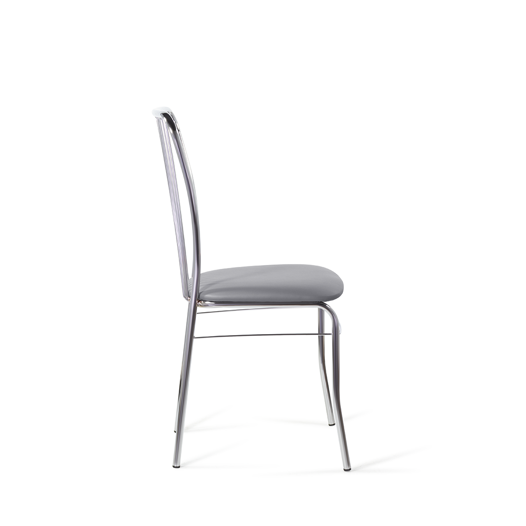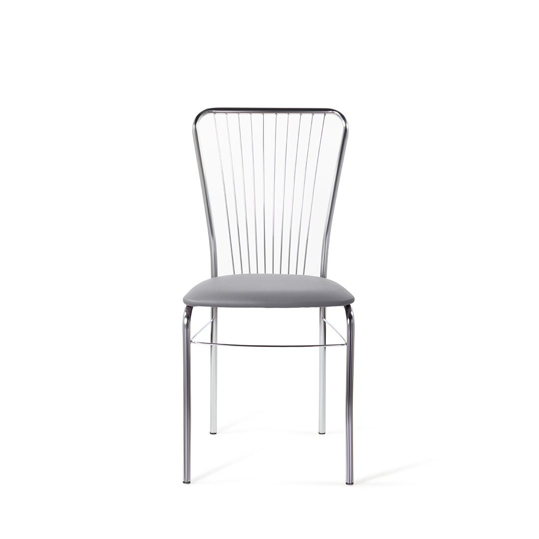 Благодаря оригинальной конструкции спинки, выполненной из тонких металлических стержней, напоминающих натянутые струны, стул выглядит стильно. Каркас выполнен из хрома.