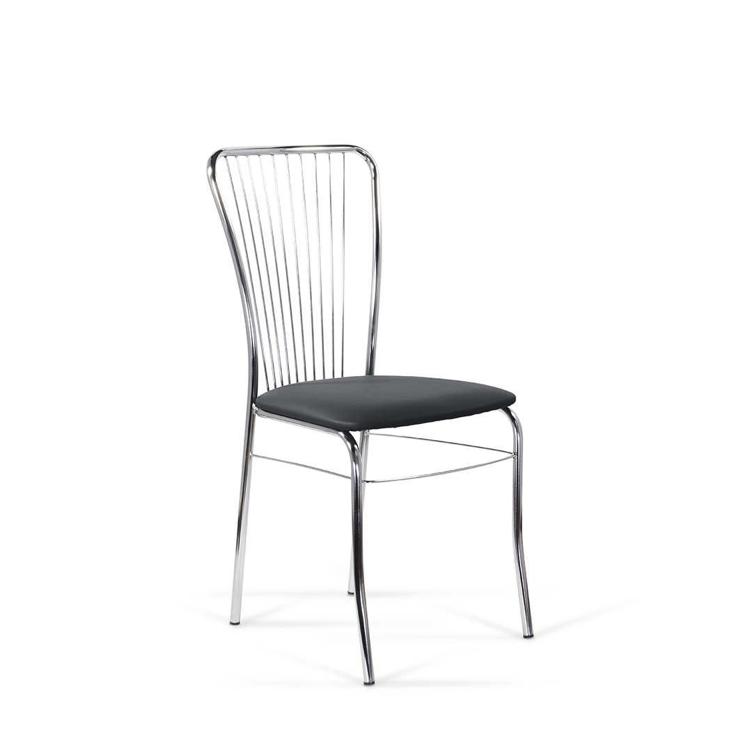 Благодаря оригинальной конструкции спинки, выполненной из тонких металлических стержней, напоминающих натянутые струны, стул выглядит стильно. Каркас выполнен из хрома.