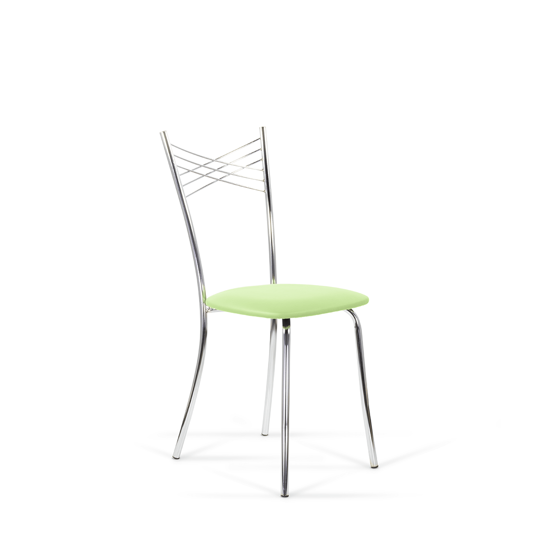 Воздушная модель стула имеет интересный дизайн спинки, представляющую собой крестообразное пресечение нескольких металлических нитей, образующих в центре маленькие ромбики. Каркас стула выполнен из хромированного металла