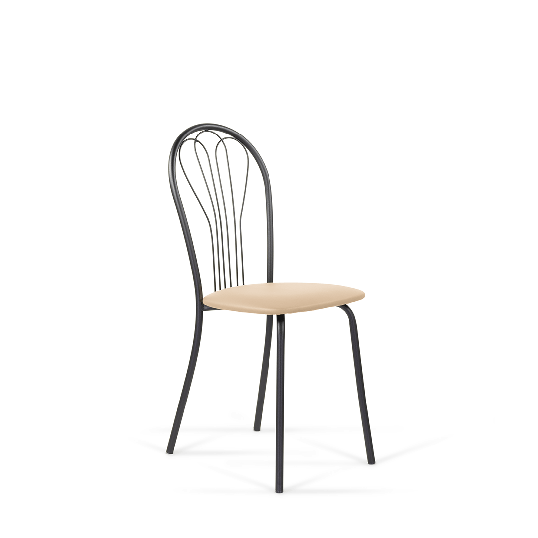 Небольшой стул с округлой спинкой и мягким сиденьем может выступать как часть обеденной зоны, а может быть самостоятельной деталью в интерьере. Каркас стула выполнен из металла.