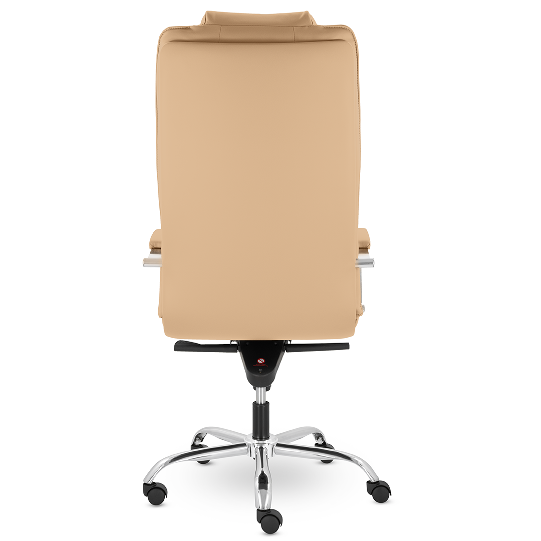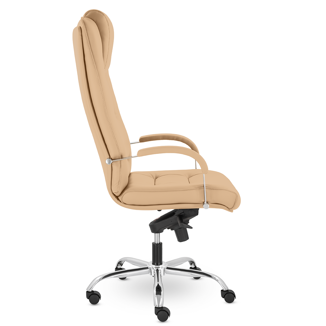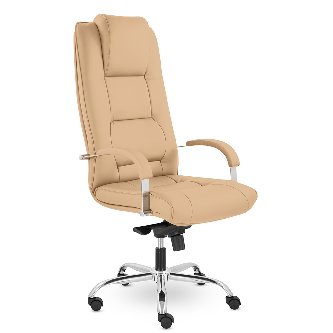 Грациозное кресло руководителя с ярко выраженным мягким подголовником. Спинка и сидение имеют горизонтальные прострочки, делящие их на квадраты. Хромированные подлокотники с мягкими накладками. Кресло стоит на хромированной крестовине, максимальная нагрузка которой 120 кг.