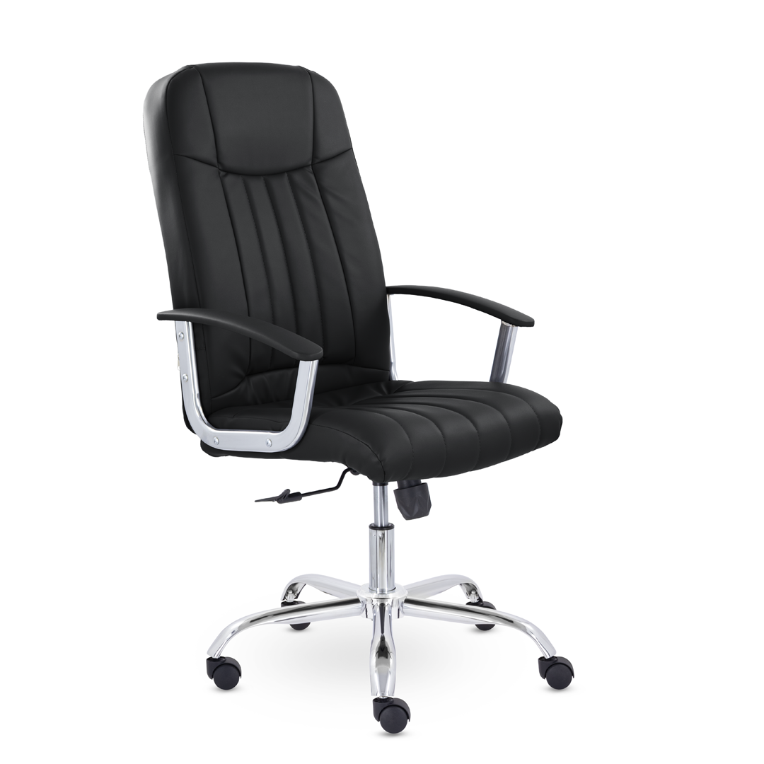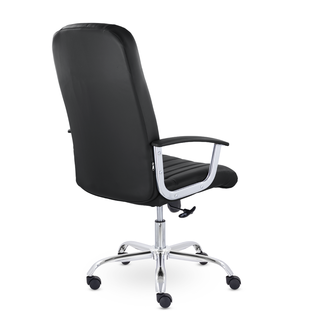 Кресло руководителя с мягкими увеличенными подушками. Широкая эргономичная спинка имеет две горизонтальные прострочки, которые отделяют подголовник от основной части спинки. Благодаря глубокому сиденью, в кресле будет удобно человеку среднего и высокого роста. Длинные хромированные подлокотники способствуют комфортной посадке в кресле.