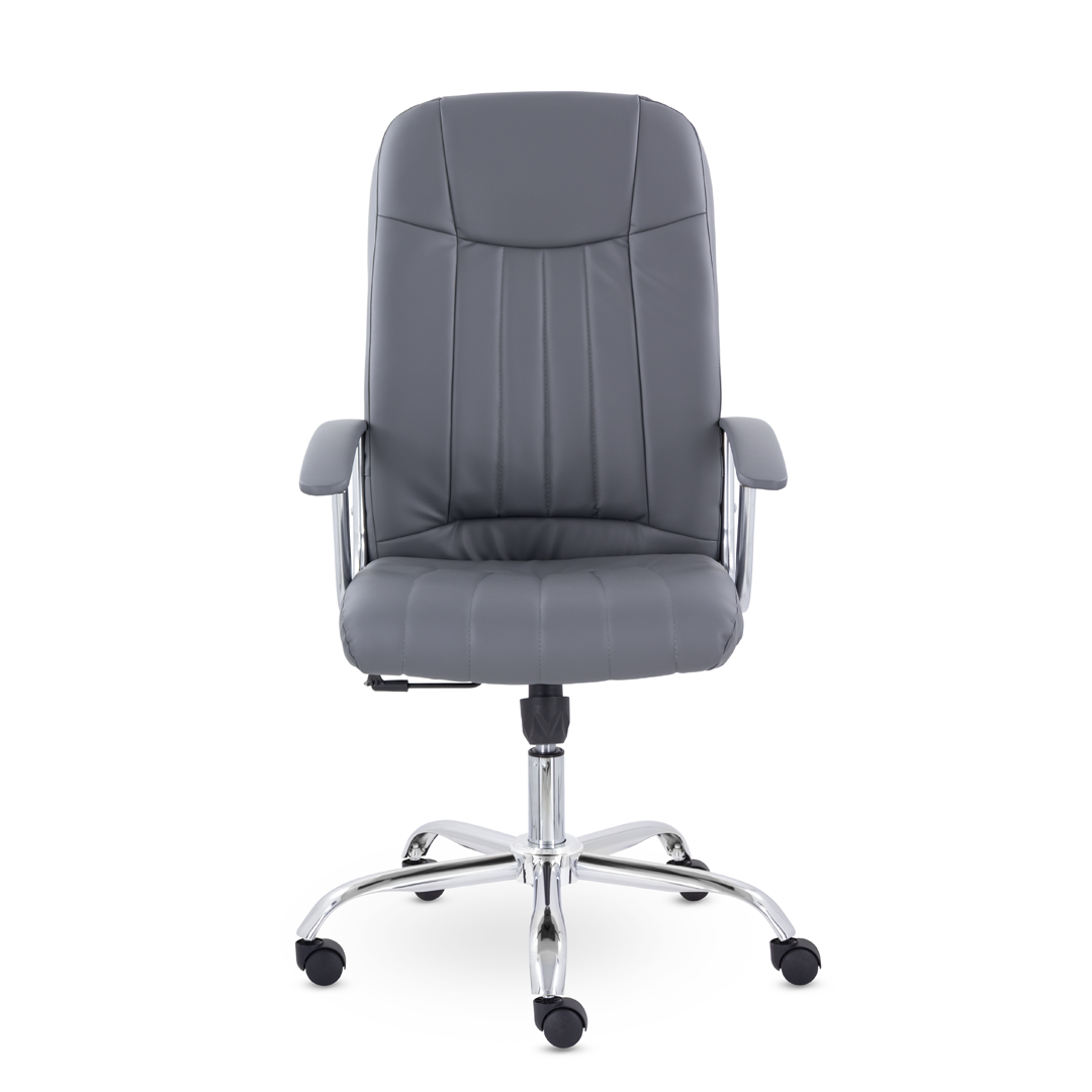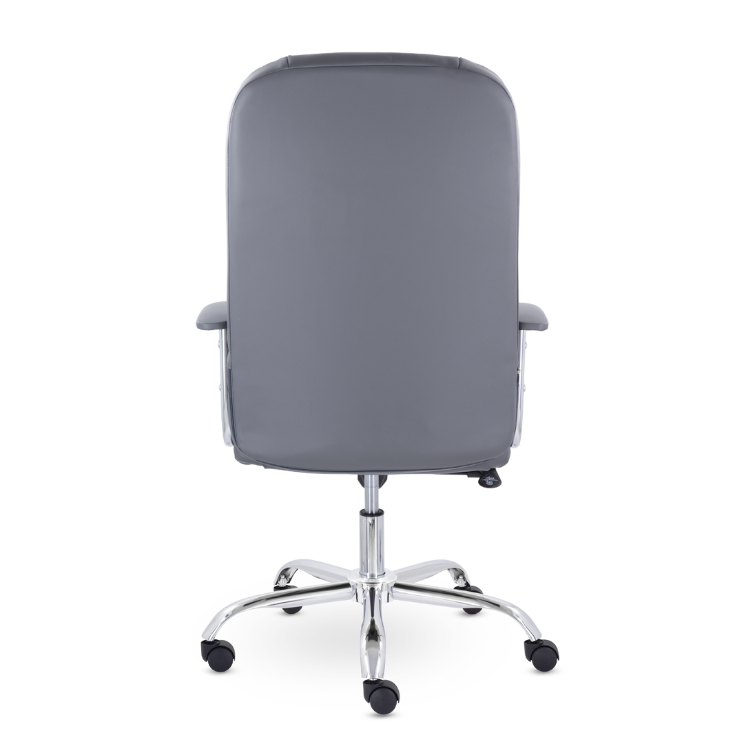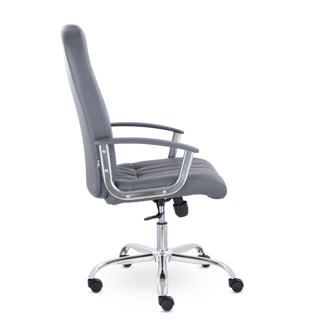 Кресло руководителя с мягкими увеличенными подушками. Широкая эргономичная спинка имеет две горизонтальные прострочки, которые отделяют подголовник от основной части спинки. Благодаря глубокому сиденью, в кресле будет удобно человеку среднего и высокого роста. Длинные хромированные подлокотники способствуют комфортной посадке в кресле.