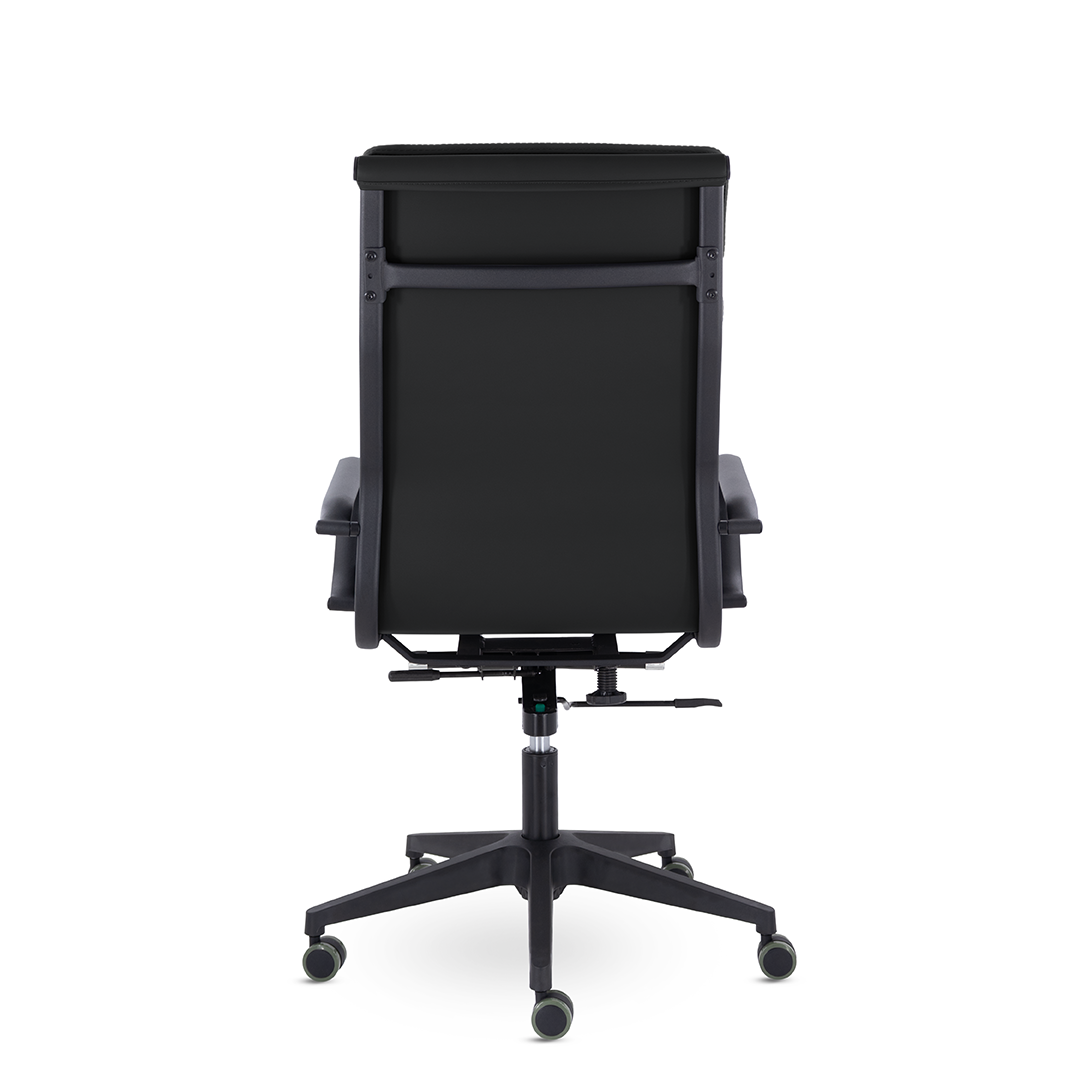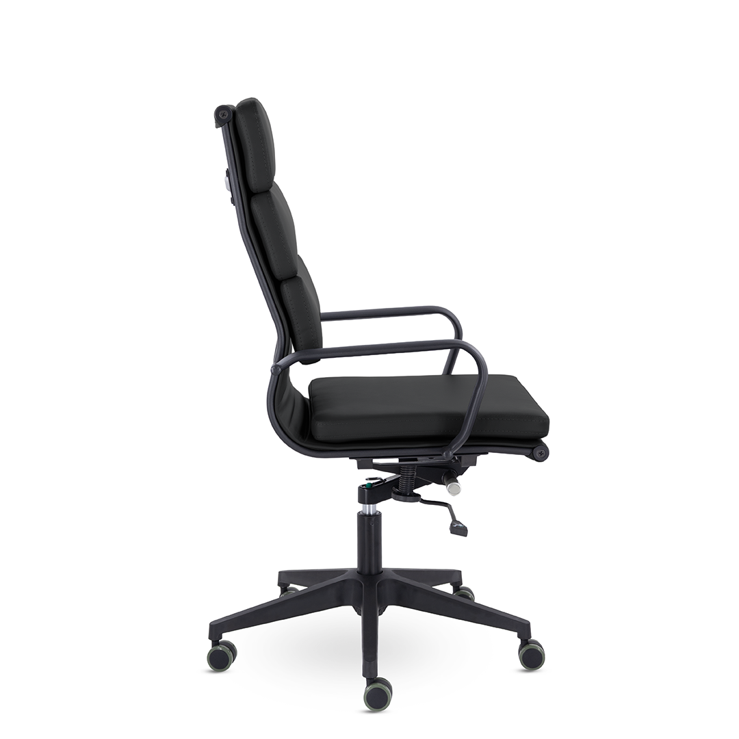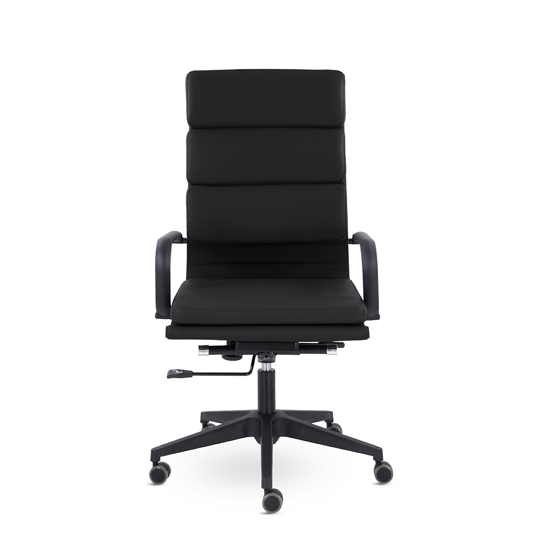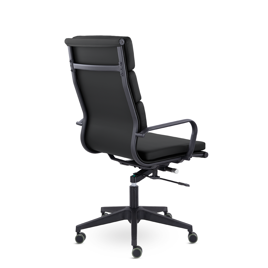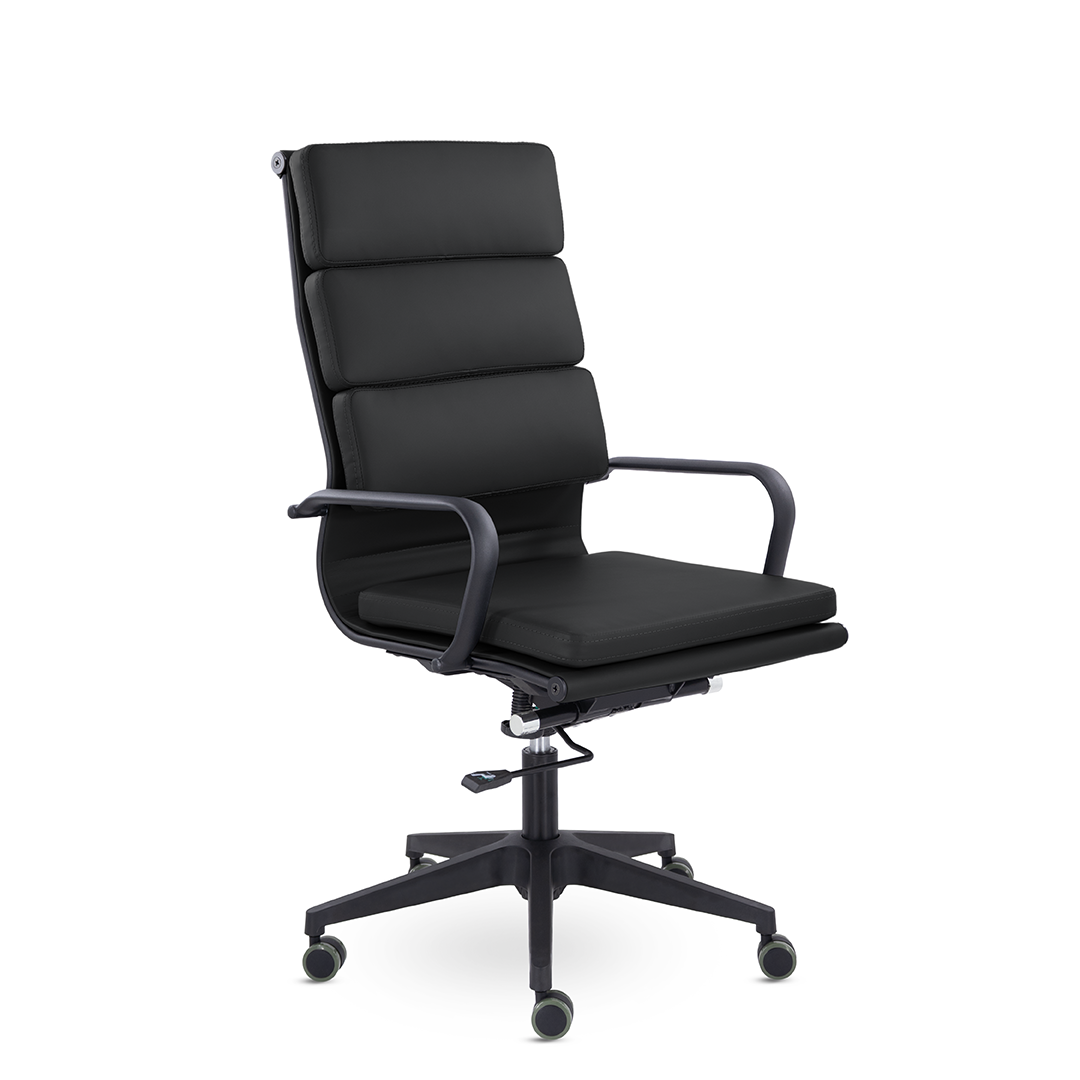 Кресло руководителя в современном металлическом каркасе. Комфорт создается благодаря мягким элементам спинки и сиденья. Черный каркас и узкая крестовина задают современный стиль креслу. Кресло отлично смотрится в строгих и открытых кабинетах.