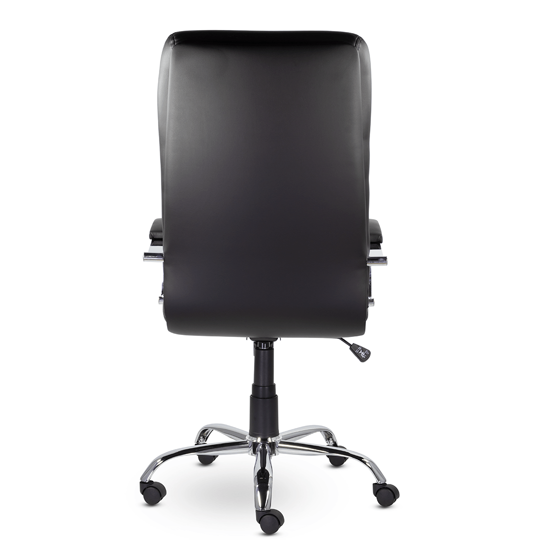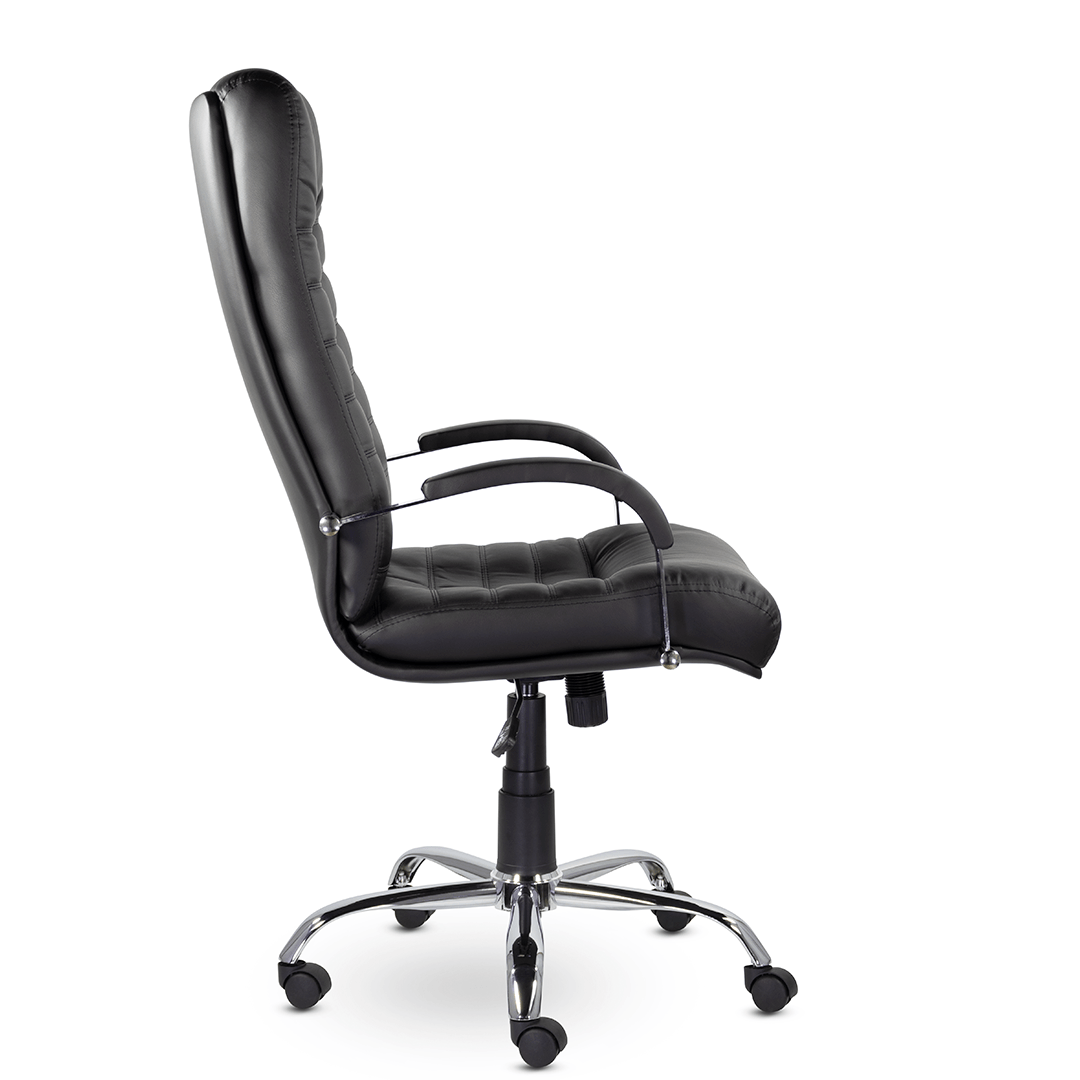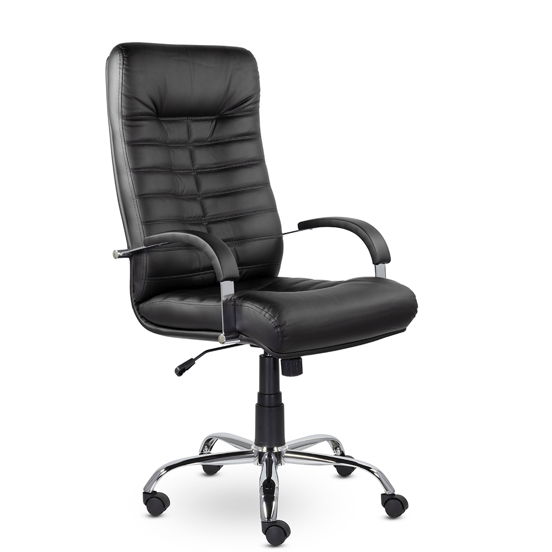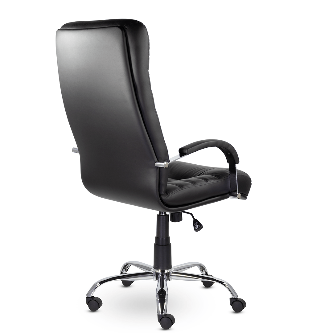 Массивное кресло руководителя с горизонтальными прострочками по ширине всей спинки и углублением. Хромированные подлокотники с мягкими накладками, возможность синхронно отклонять спинку и фиксировать сидение в рабочем положении. Максимальная нагрузка - 120 кг