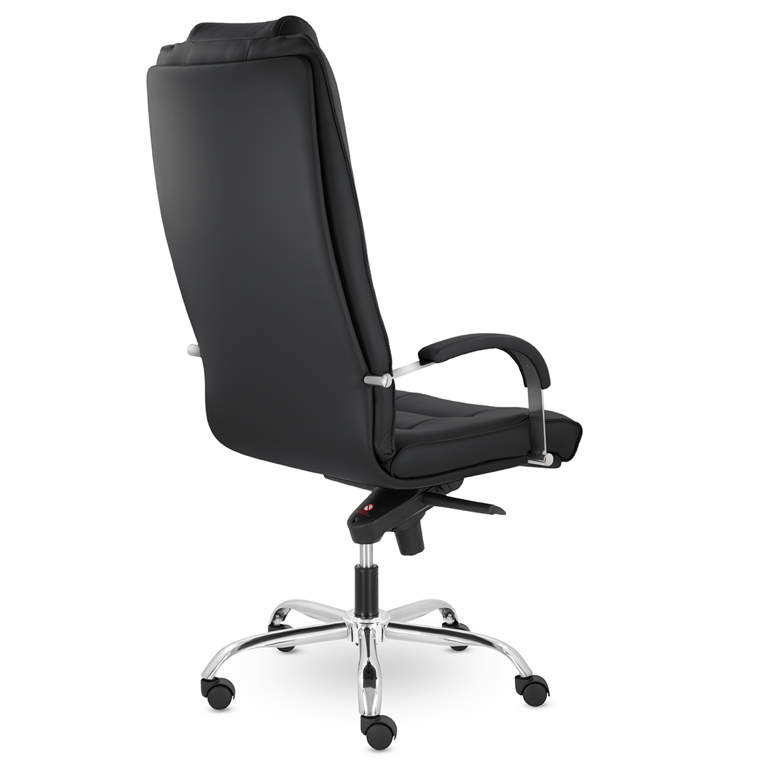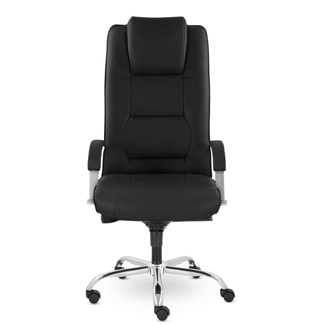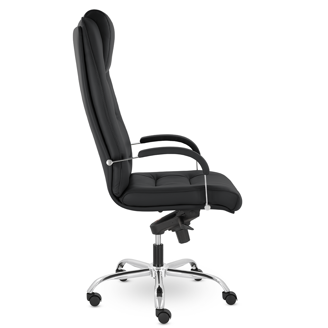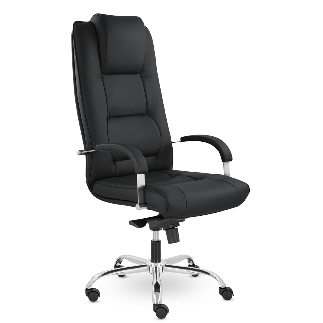 Грациозное кресло руководителя с ярко выраженным мягким подголовником. Спинка и сидение имеют горизонтальные прострочки, делящие их на квадраты. Хромированные подлокотники с мягкими накладками. Кресло стоит на хромированной крестовине, максимальная нагрузка которой 120 кг.