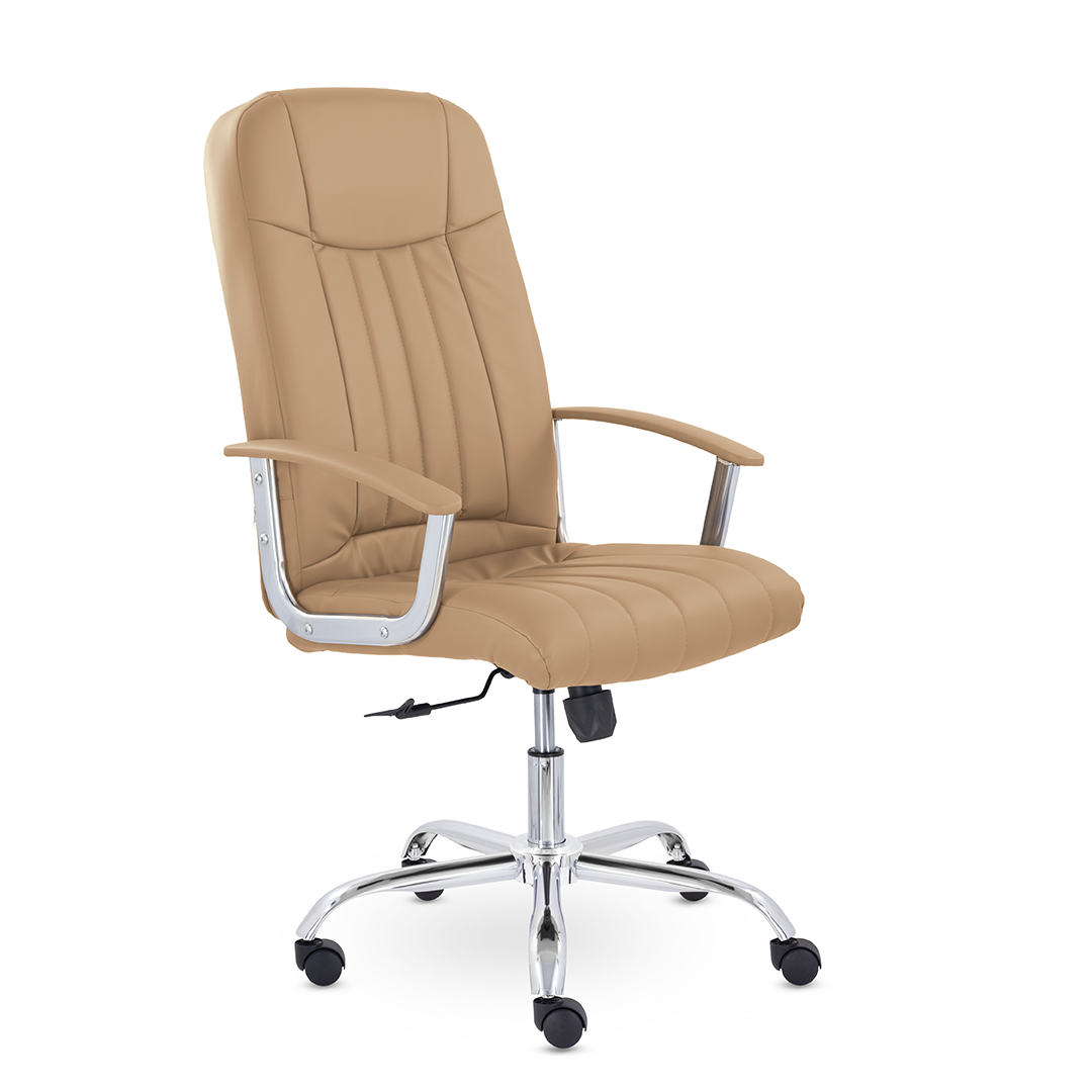 Кресло руководителя с мягкими увеличенными подушками. Широкая эргономичная спинка имеет две горизонтальные прострочки, которые отделяют подголовник от основной части спинки. Благодаря глубокому сиденью, в кресле будет удобно человеку среднего и высокого роста. Длинные хромированные подлокотники способствуют комфортной посадке в кресле.