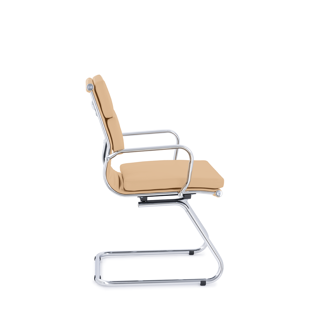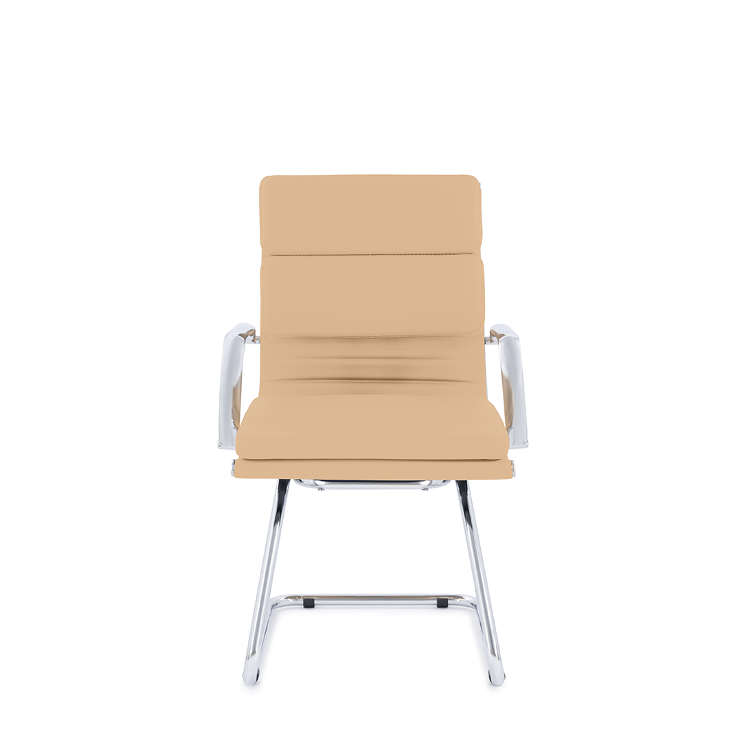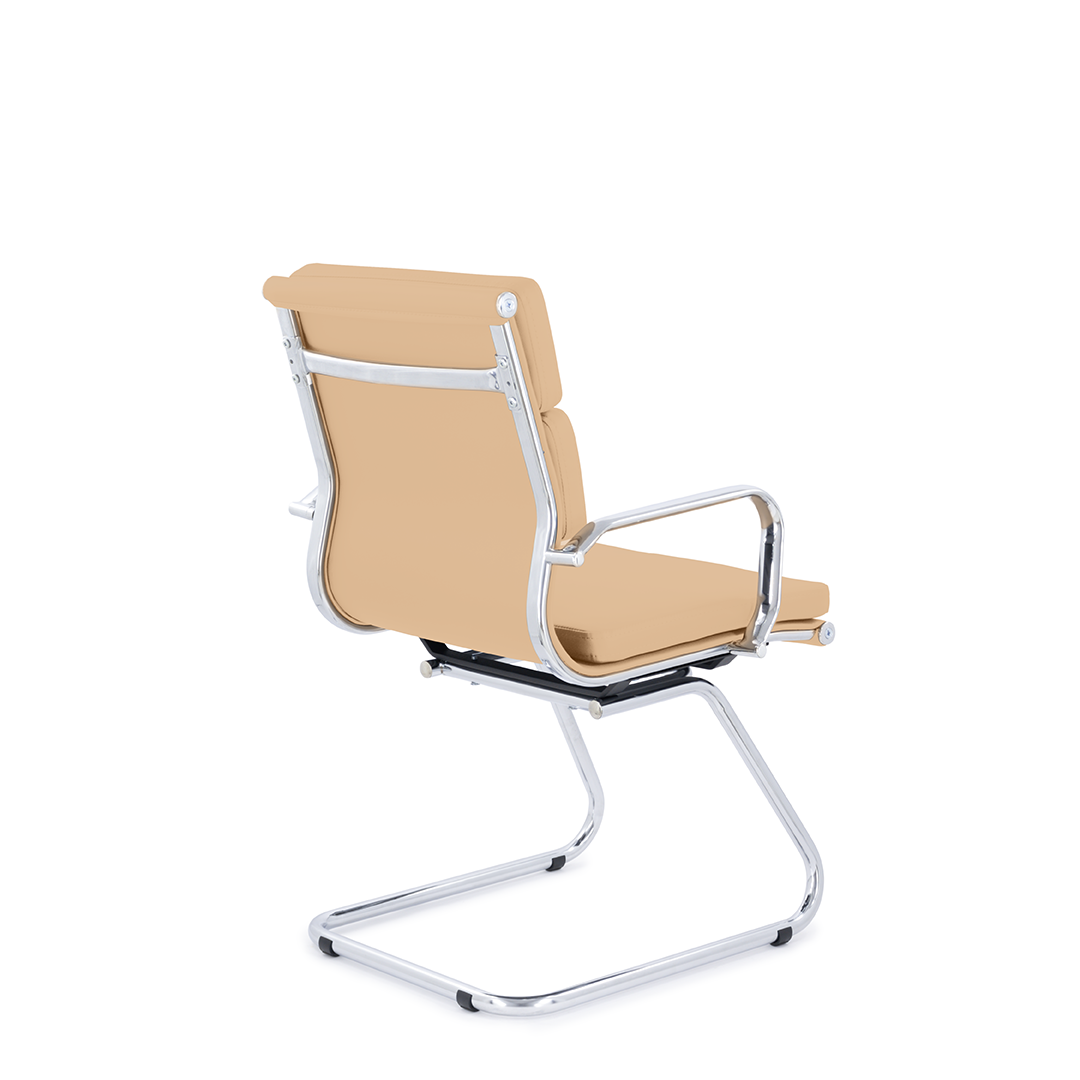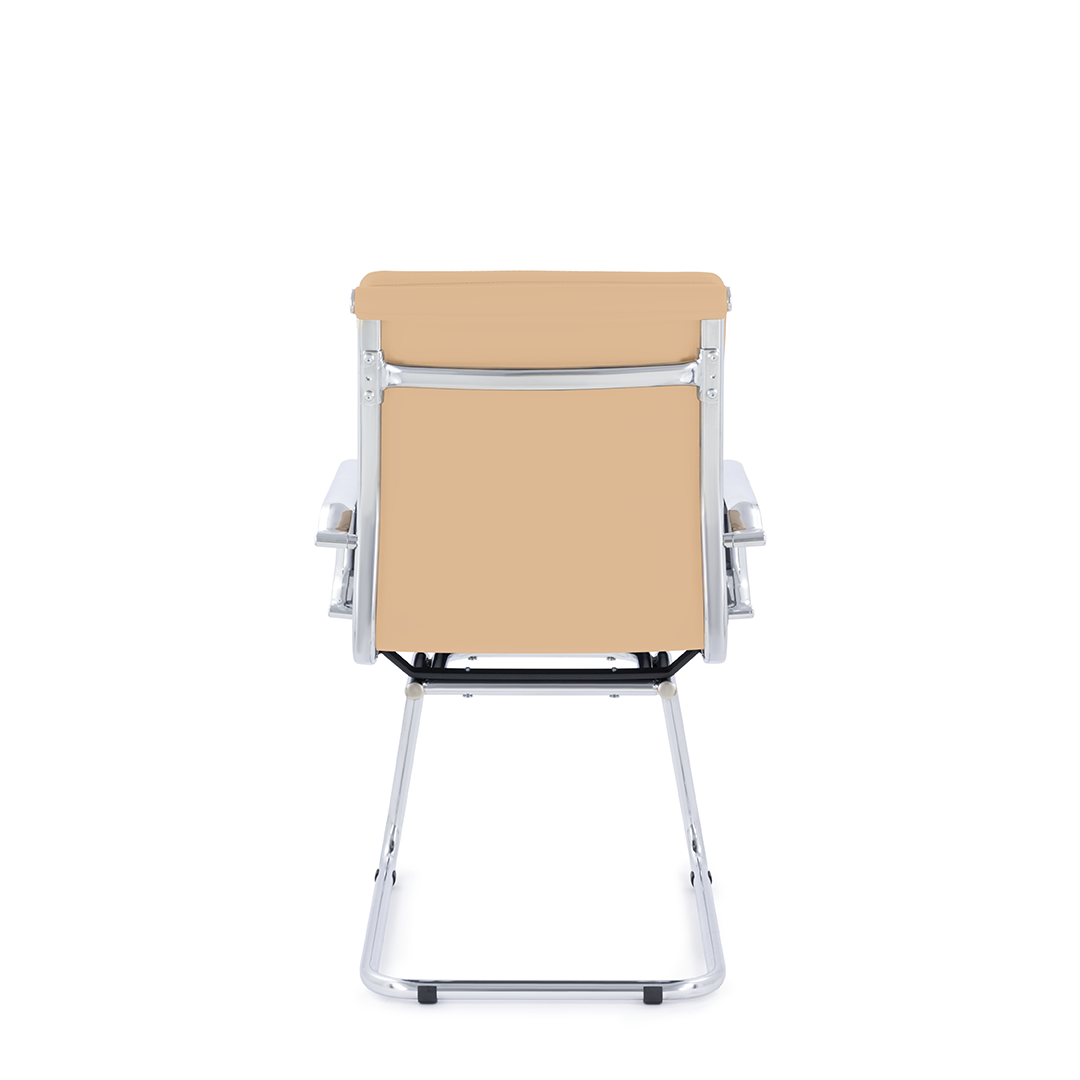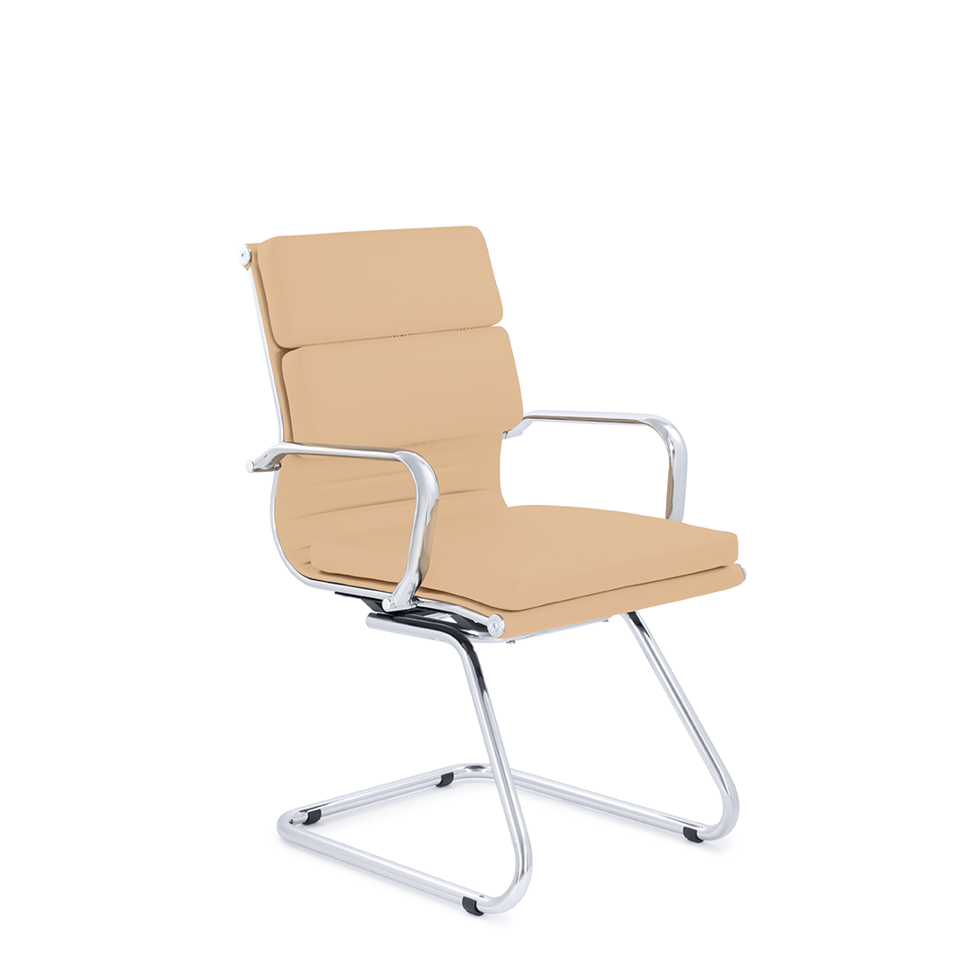 Кресло руководителя в современном металлическом каркасе. Комфорт создается благодаря мягким элементам спинки и сиденья, хромированным полозьям. Кресло отлично смотрится в строгих и открытых кабинетах.