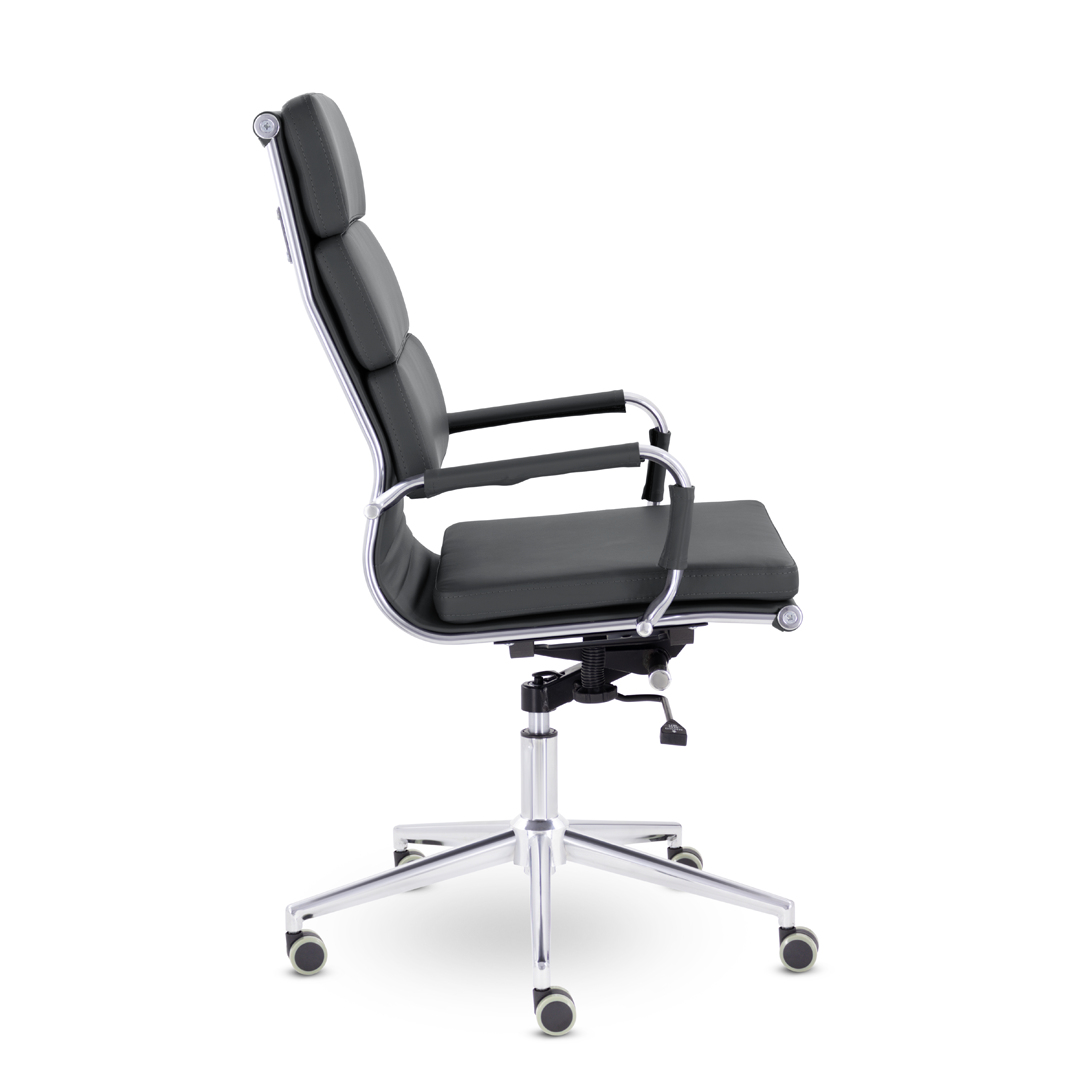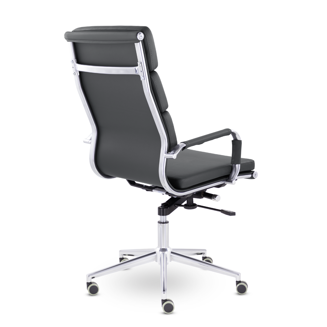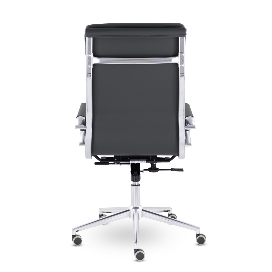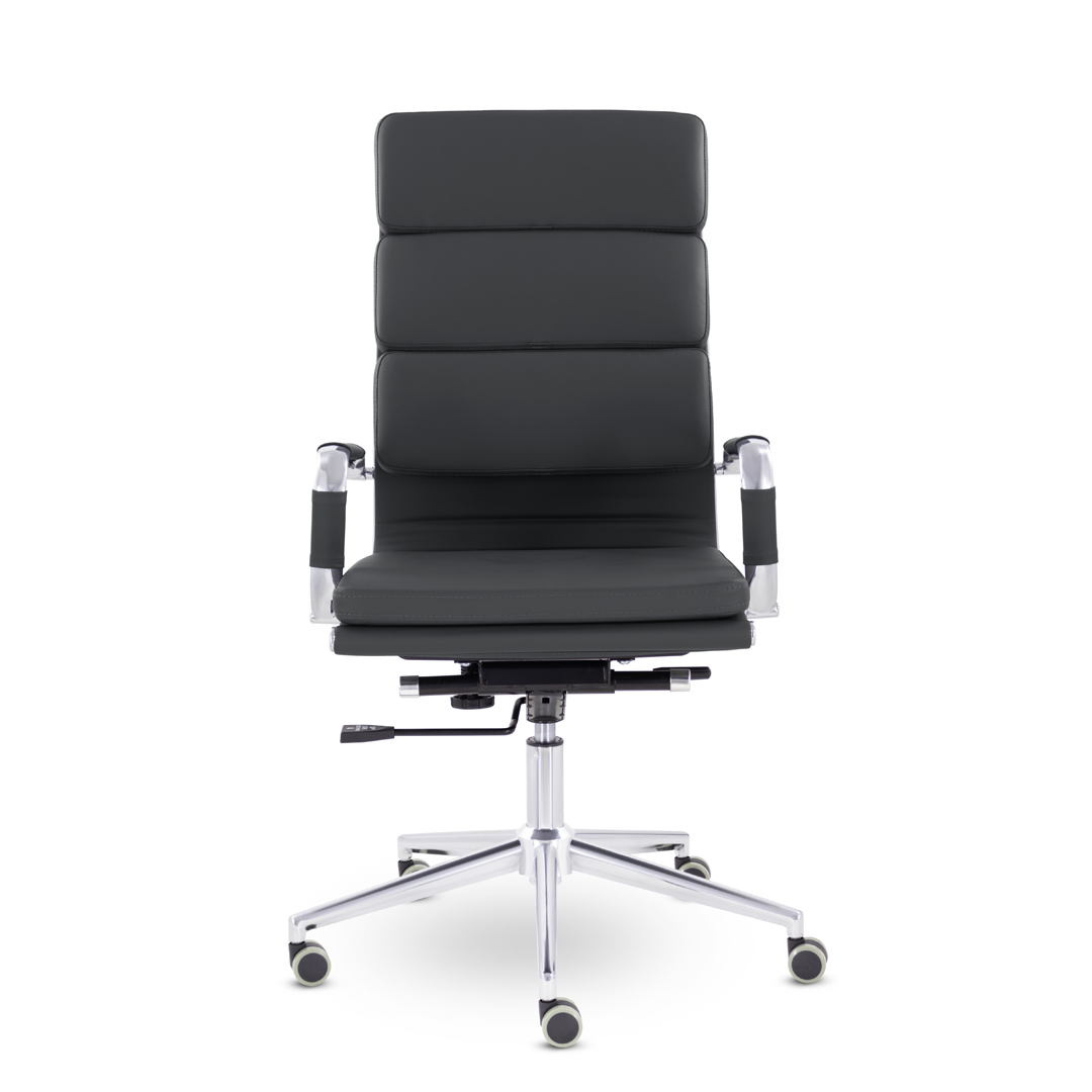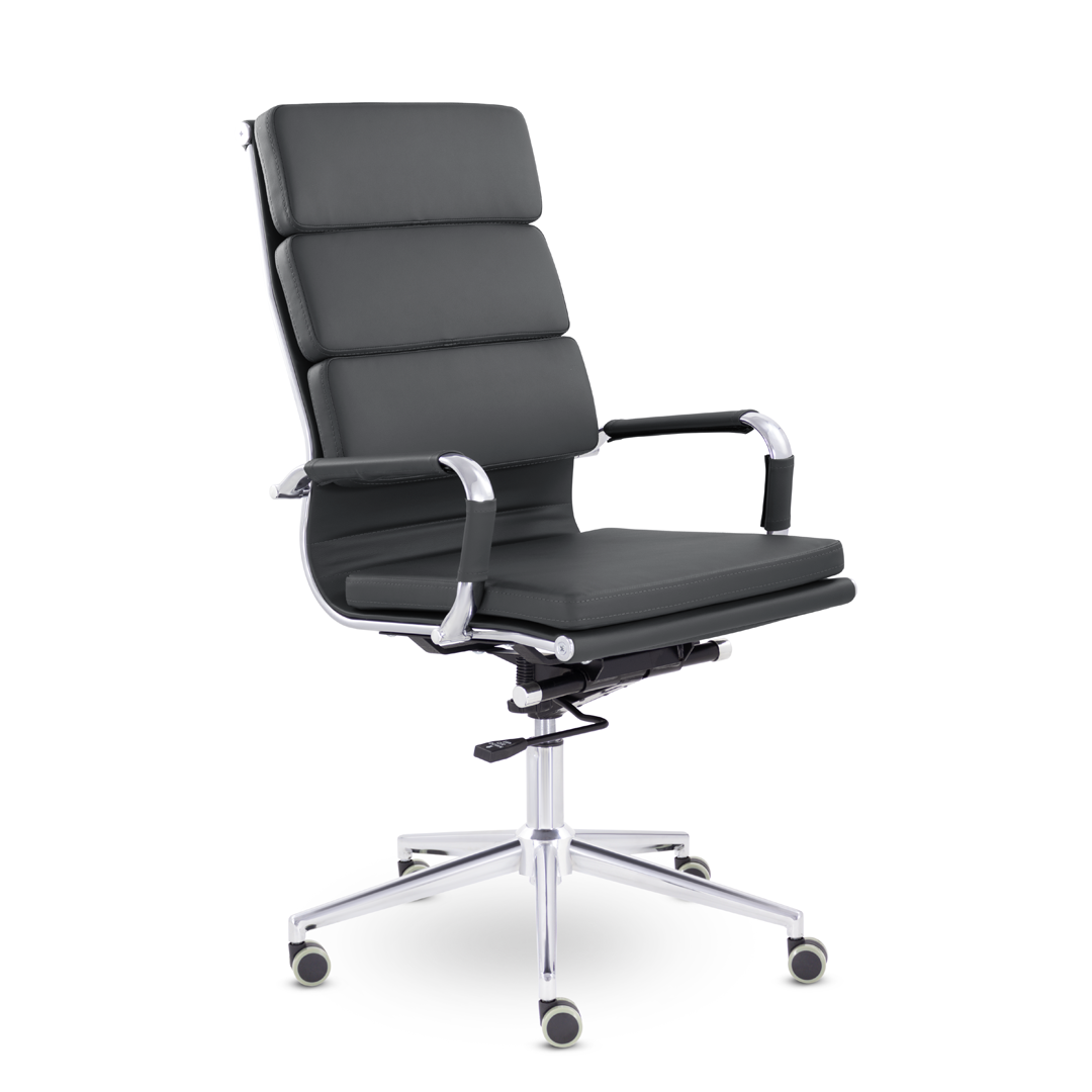 Кресло руководителя в современном металлическом каркасе. Комфорт создается благодаря мягким элементам спинки и сиденья. Зеркальный хромированный каркас и узкая крестовина задают современный стиль креслу. Кресло отлично смотрится в строгих и открытых кабинетах.