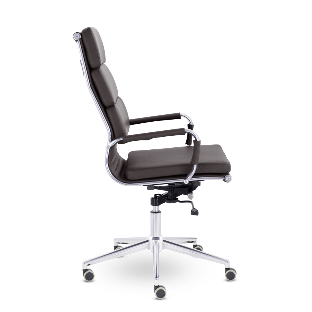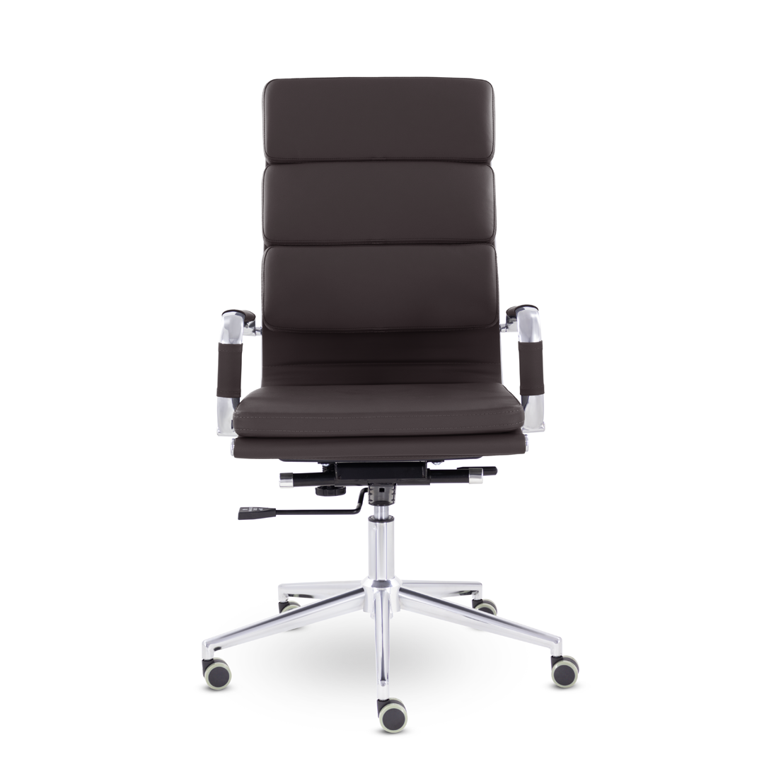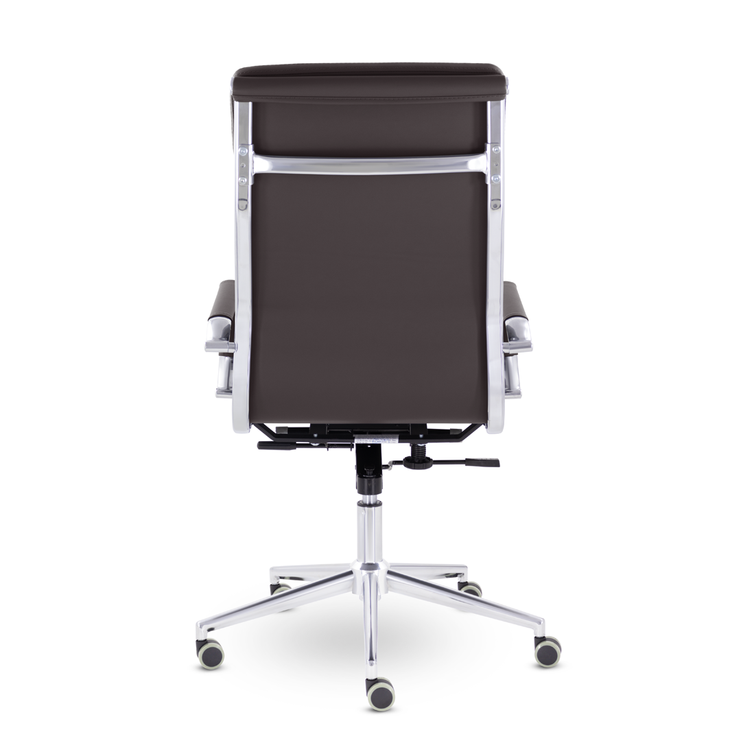 Кресло руководителя в современном металлическом каркасе. Комфорт создается благодаря мягким элементам спинки и сиденья. Зеркальный хромированный каркас и узкая крестовина задают современный стиль креслу. Кресло отлично смотрится в строгих и открытых кабинетах.